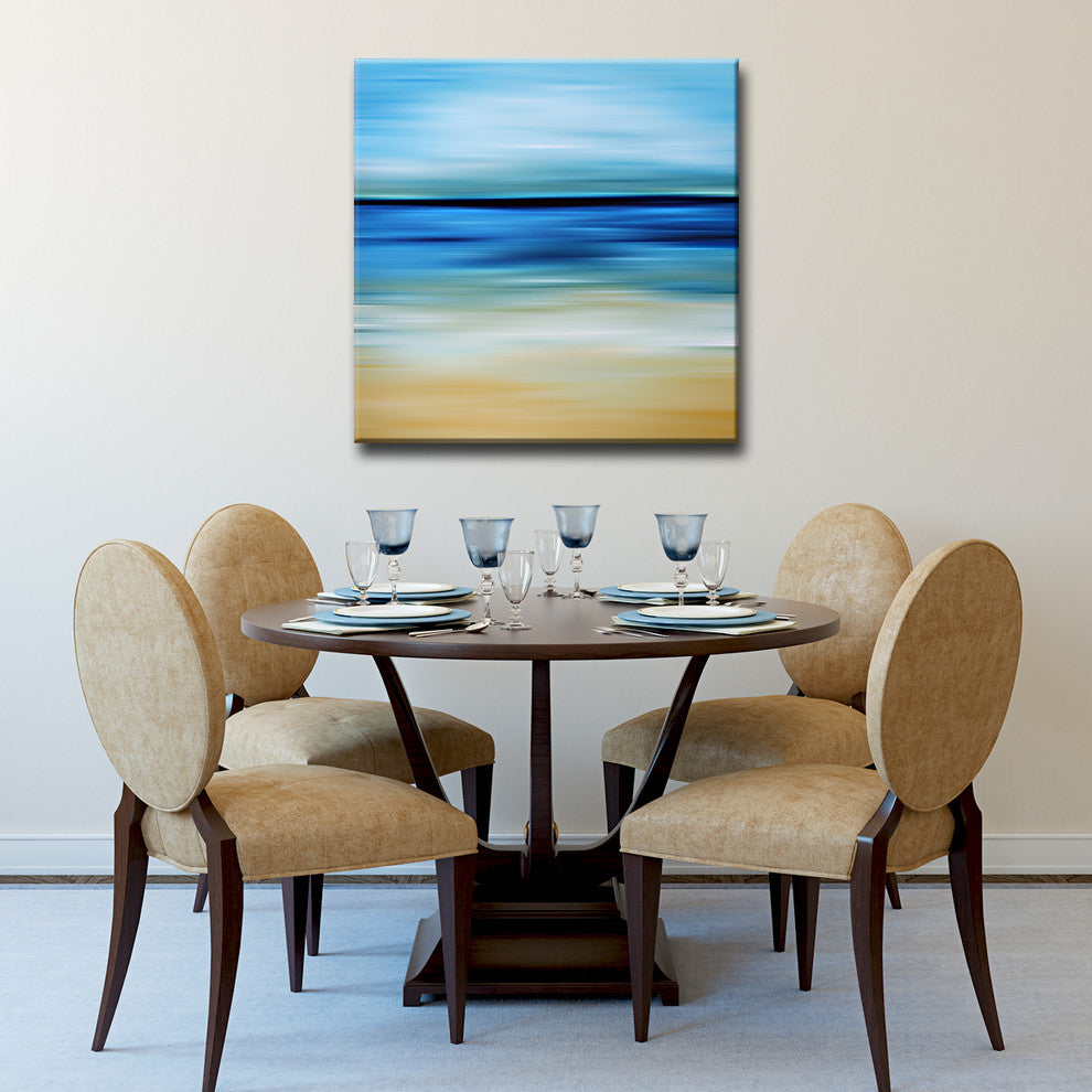 A mod, cosmic horizon or interstellar landscape is characteristic of Ready2HangArts latest collection Blur Stripes. These celestial works compose an austere series featuring a color palette compatible with most every home decor style and taste. ''Blur Stripes IV'' is an obscure beach inspired landscape; deep tan rests at the base as the gradient flows up into a classic horizon, from the foamy white low-tide, through the deep ocean blue, into the fluffy, azure sky. Nurture the cohesive design within your space through a tailored, Blur Stripes canvas art piece; experience your interior design dreams borne.