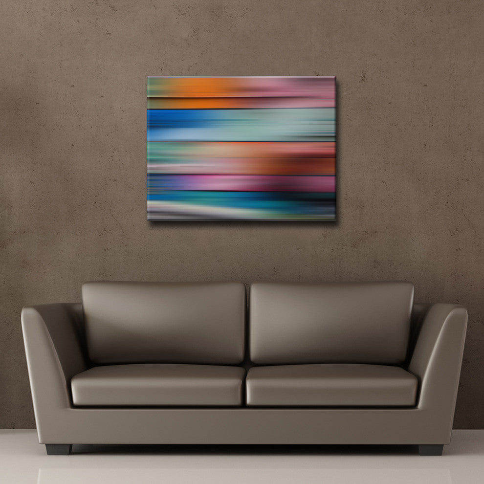 A mod, cosmic horizon or interstellar landscape is characteristic of Ready2HangArts latest collection Blur Stripes. These celestial works compose an austere series featuring a color palette compatible with most every home decor style and taste. ''Blur Stripes XVII'' is a melange of blue, pink and orange; thin dark lines contour the streaks into firm bands. Nurture the cohesive design within your space through a tailored, Blur Stripes canvas art piece; experience your interior design dreams borne.