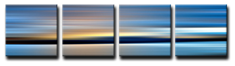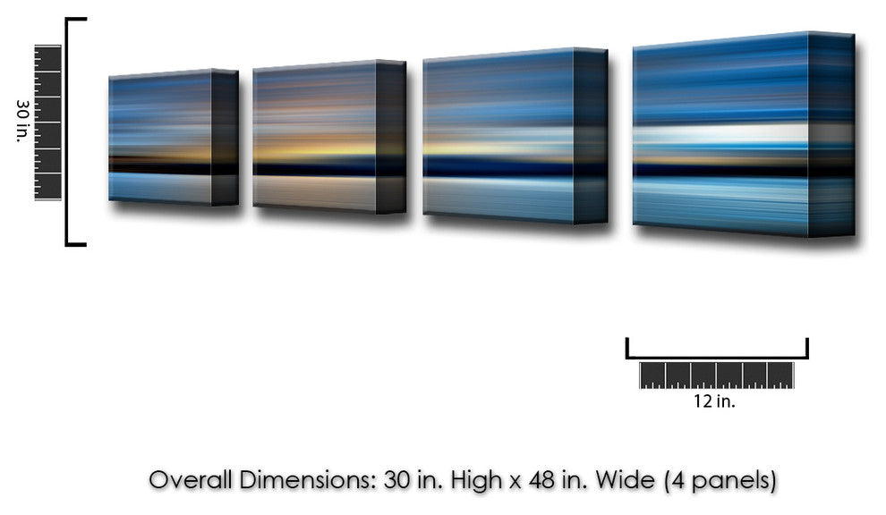 A mod, cosmic horizon or interstellar landscape is characteristic of Ready2HangArts latest collection Blur Stripes. These celestial works compose an austere series featuring a color palette compatible with most every home decor style and taste. ''Blur Stripes XXXVIII'' is an astounding m?lange of colors and light envisioning a surreal coastal dawning; an array of cyan, blue, and azure tones span the arrangement, contrasted with a gold-peach hue, and traces of pure white light. Nurture the cohesive design within your space through a tailored, Blur Stripes canvas art piece; experience your interior design dreams borne.