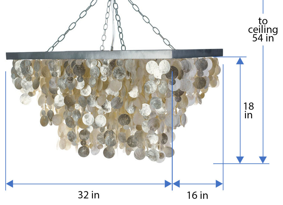 Lamp body: 32 inches long x 16 inches wide x 18 inches high. Height from ceiling to bottom of lamp 40 inches. Length of hanging chain be shortened by removing links. Hand made from champagne colored Capiz seashells. Takes three 60W type A bulbs (not included). Works with incandescent, halogen or LED bulb. Use of non-frosted bulb recommended for appearance. Lamp is hard wired. Wipe clean with damp cloth. This timeless chandelier is the perfect lighting piece for over your dining table or kitchen island. With hundreds of hand cut champagne colored capiz seashells tied to matt silver frame this lamp works as much in a modern home as it does in a traditional one. The three 60 Watt bulbs provide ample light for your space while making the shells glow at the same time.