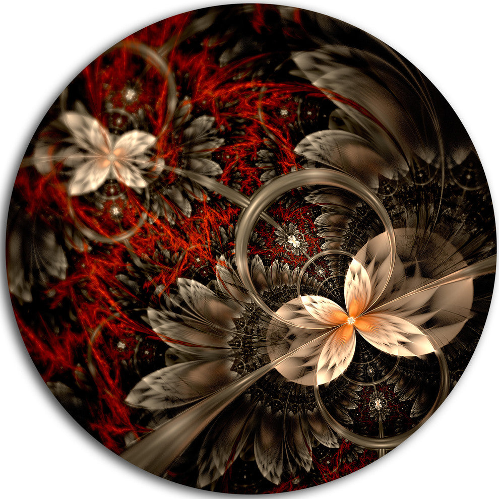 Bring Contemporary Abstraction to your home with this large Circle Metal wall art. This Red and Orange Fractal Flower Pattern Metal Artwork makes it the focal point of any room or office.