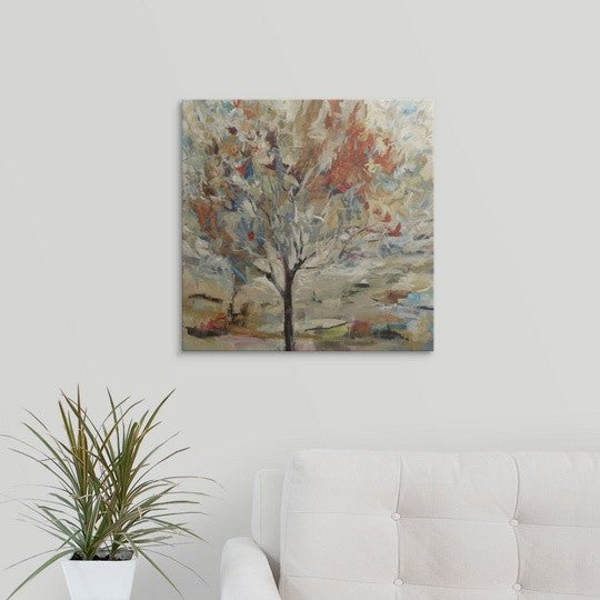 Gallery-wrapped canvas entitled, "Red Bird Tree".Contemporary painting of a single tree with vibrant leaves and branches, on a background filled with multicolored patches of thin and thick brushstrokes.Our wrapped canvases feature a proprietary design that prevents warping or sagging over time. By using archival inks and artist-grade canvas, our premium canvases are sure to add that extra touch to any space. Lastly, our canvases are finished with a closed back that incorporates pre-installed hanging hardware for easy installation.