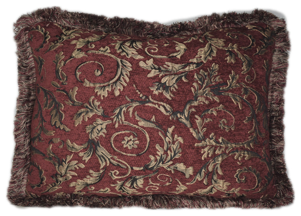 You will love the intense brick red color and the deep rich metallic gold leaf in these pillows. They are made of soft high grade chenille. So versatile they look great with Victorian throw rugs and work well in transitional designs as well. The leaf motif is on both sides! They have a plush matching brush fringe. Complete pillows with polyester fiber filled inserts that are removable. They have a hidden zipper. Want a more contemporary or transitional look ask to have them make with no fringe and added solid piping. Comes in three sizes.