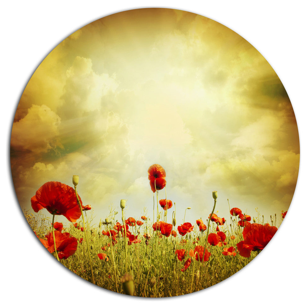 Bring Contemporary Abstraction to your home with this large Circle Metal wall art. This Red Poppies on Grunge Background Metal Artwork makes it the focal point of any room or office.