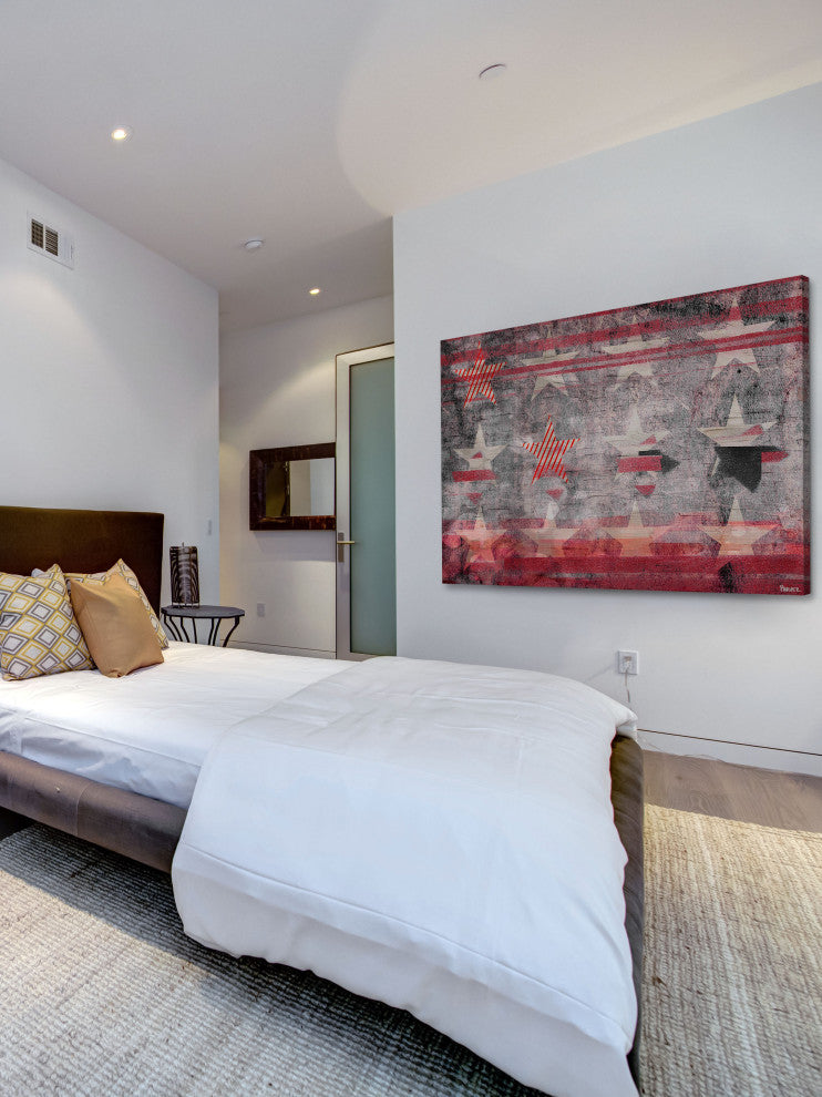 Striking and unique, the "Red Striped Stars" Print on Canvas by Parvez Taj will bring your walls to life. Printed on canvas, this 18 inch wide by 12 inch tall contemporary artwork will make a statement in any living room, dining room, or bedroom.- Fine art canvas print by Parvez Taj- Professionally hand stretched- Gallery wrapped in sustainable, non-warping wood- Arrives ready to hang- Made in the USA- Includes a certificate of authenticity- Artist signature on the front