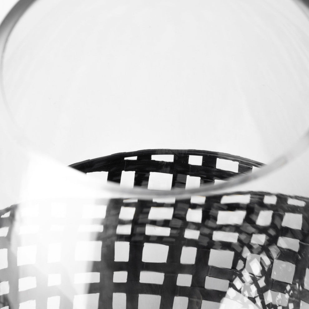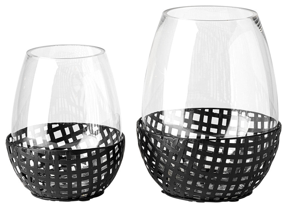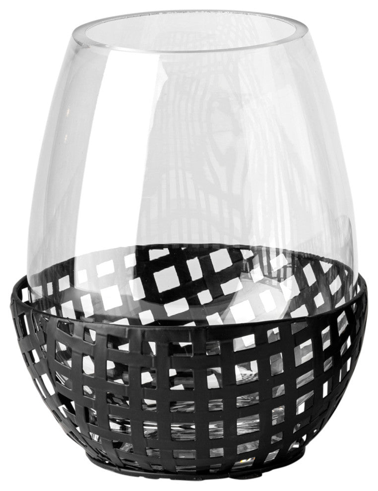 The Reena is a beautiful votive holder that features a woven, metal base with a curved hurricane glass cover.