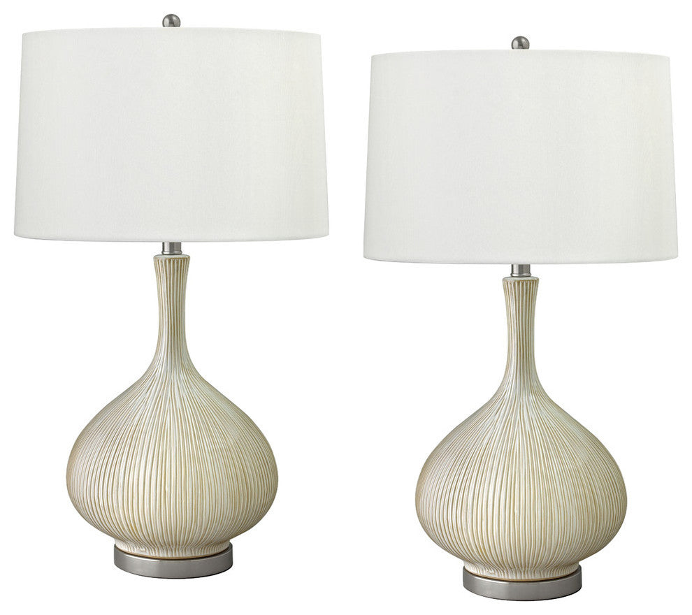 Standard Lamp Specifications for #288:Product Type: Table LampHeight: 29"Finish: White Ribbed CeramicConstruction: Ceramic/SteelSocket: (1) Aluminum 3-way Med. Base Type A 150W Max socket(s). (Bulb(s) not included)Switching: (1) 3-way turn knob switch(es) located on the socket.Cord: 6''5'' (from base) long clear silver SPT-2 cord set with a 2 prong polarized plug.UL/CUL and/or ETL listed: YesHarp Size: 9 inches (including the saddle)Standard Packing: 2 per carton (shade packed separately).Lamps & Shades per SKU: 2Lamping: (1) Aluminum 3-way Med. Base Type A 150W Max socket(s).Shade Size and Description: White fabric laminated to styrene hardback drum with rolled edge measuring 15" x 16" x 10.5" w/ .5" drop (Top x Bottom x Slant).Bulb Included: NoMaterial Description: constructed from ceramic. Painted by hand.