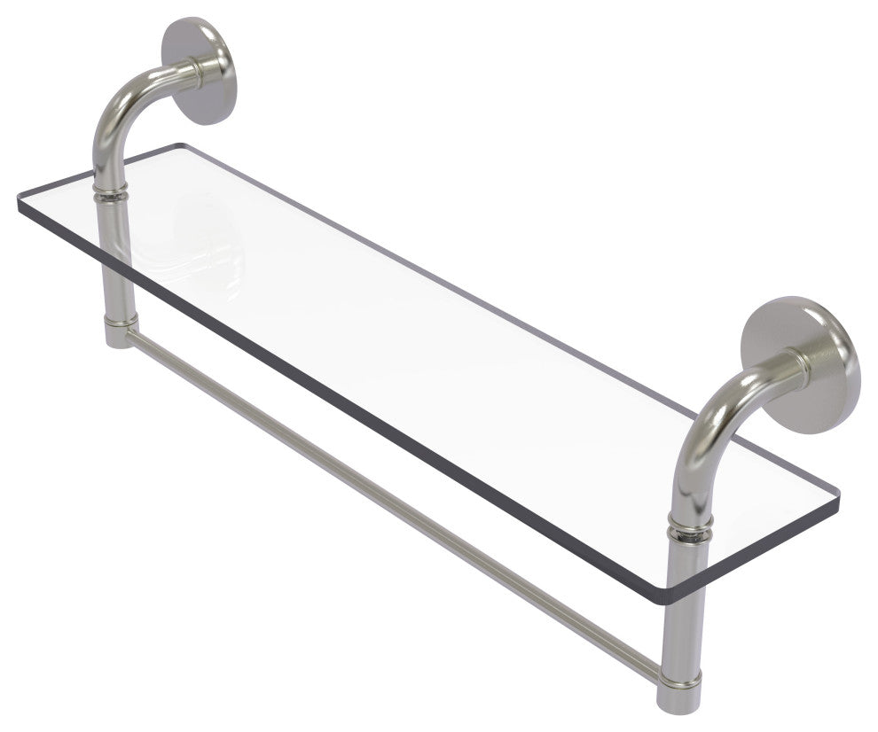 This elegant and fun design from the Remi collection ensures this glass shelf will leave a statement in your bathroom. The curved lines meet modern circles and mesh seamlessly with a sturdy glass shelf and a towel bar as a final touch, making this accessory minimal and efficient for your space! One of the many coordinating accessories in the Allied Brass Collection of accessories, this subtle glass shelf is the perfect complement to your bathroom decor.Satin Nickel, a lightly brushed warm gray metallic look that helps resist fingerprintsCrafted from the Finest Solid Brass MaterialsMade with 3/8" thick glass for safety and strengthConcealed screw mounting hardware installs easilySpace saving design makes efficient use of your spaceAvailable in a wide variety of lifetime designer finishesProvided with a Limited lifetime warranty