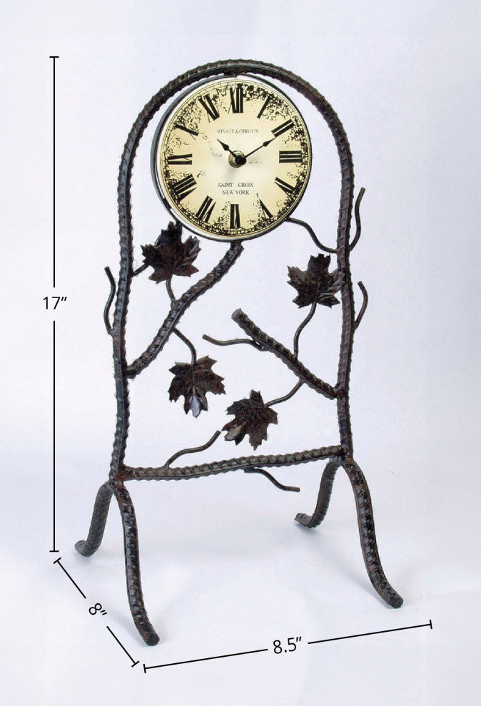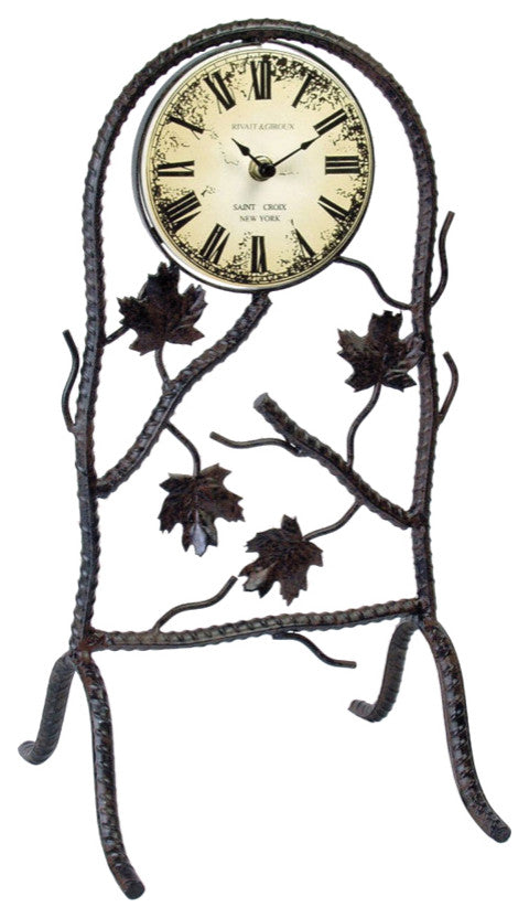 Furnish your console tables with eye-catching Analog Metal Quartz Tabletop Clock. It features a metalwork design that is both functional and durable. Brimming with vintage aesthetics, the clock features roman numerals that exudes an antique feel. The metal framework is shaped like wrought iron pieces used in early architecture.Features:Overall product dimensions are 8.5" W x 8" D x 17" HTraditional design with aged black Roman numeralsInspired by wrought iron works in the earlier decadesQuartz movement clock takes a single AA batteryCompact size ideal for smaller tables or nightstandsDimensions:Mantel ClockAssembled Product: 8.5 inches wide x 8 inches deep x 17 inches high.