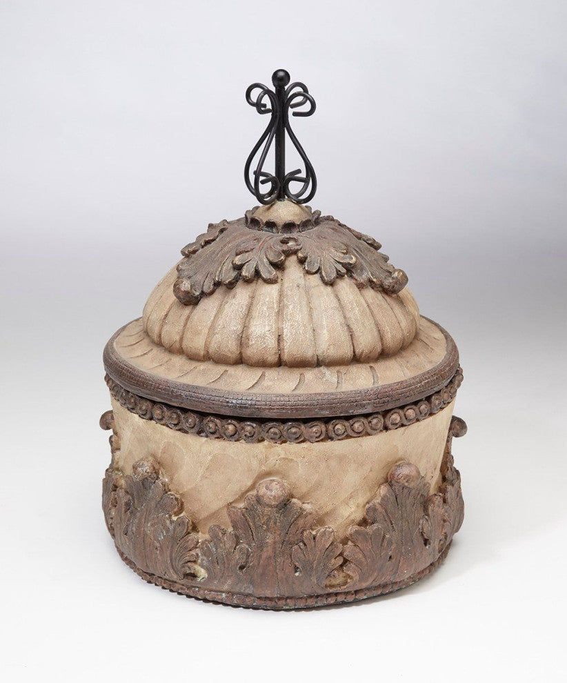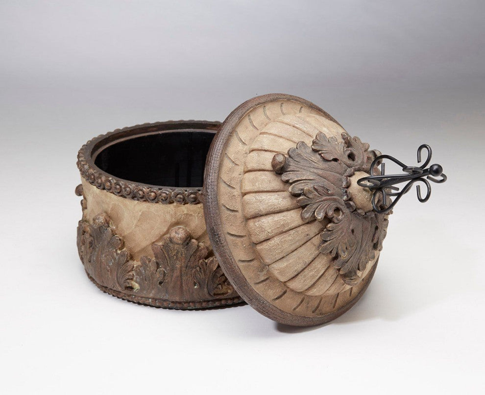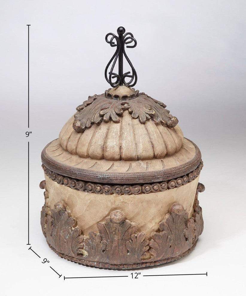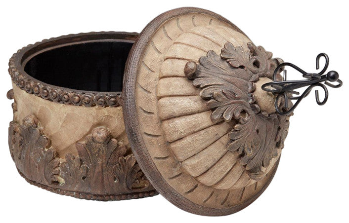 Store your jewelry or other trinkets with the Round Decorative Box. The box brings a traditional look with its round shape and matching lid. The container can keep various items such as keys, coins, etc. Pretty much a decorative piece, this is perfect to place atop your console tables or nightstands.Features:Overall product dimensions are 12" W x 9" D x 9" HMade from resin in hand painted finish for classy aestheticsThe container comes with a matching lid, making its content secureAmple storage for keeping various small itemsLow-maintenance and easy to cleanDimensions:Decorative Accent PieceAssembled Product: 12 inches wide x 9 inches deep x 9 inches high.