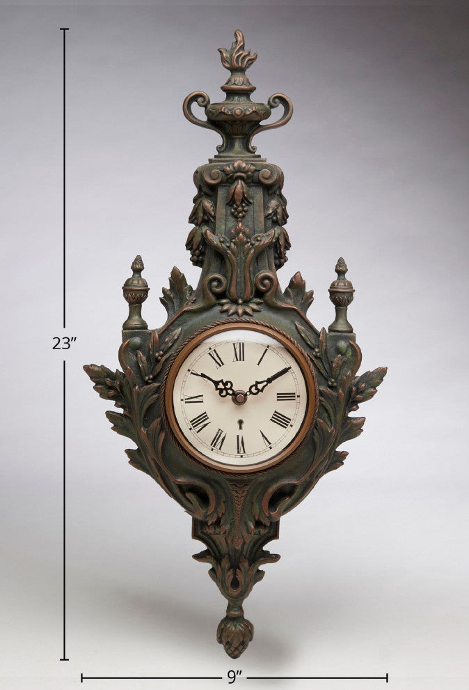 Bring the gothic aesthetics to contemporary settings with the Torch Design Wall Clock. It boasts heavy details that are reminiscent of antique pieces. The wall clock displays roman numerals which further adds to its antiquity. It makes for the perfect statement piece courtesy of its ornate design and built.Features:Overall product dimensions are 9" W x 4.25" D x 23" HCompact size ideal for smaller tables or nightstandsClassic roman numerals for a distinctive touchOrnate in shape and design which makes for a great accent pieceAvailable in multiple color variationsDimensions:Wall ClockAssembled Product: 9 inches wide x 4.25 inches deep x 23 inches high.