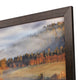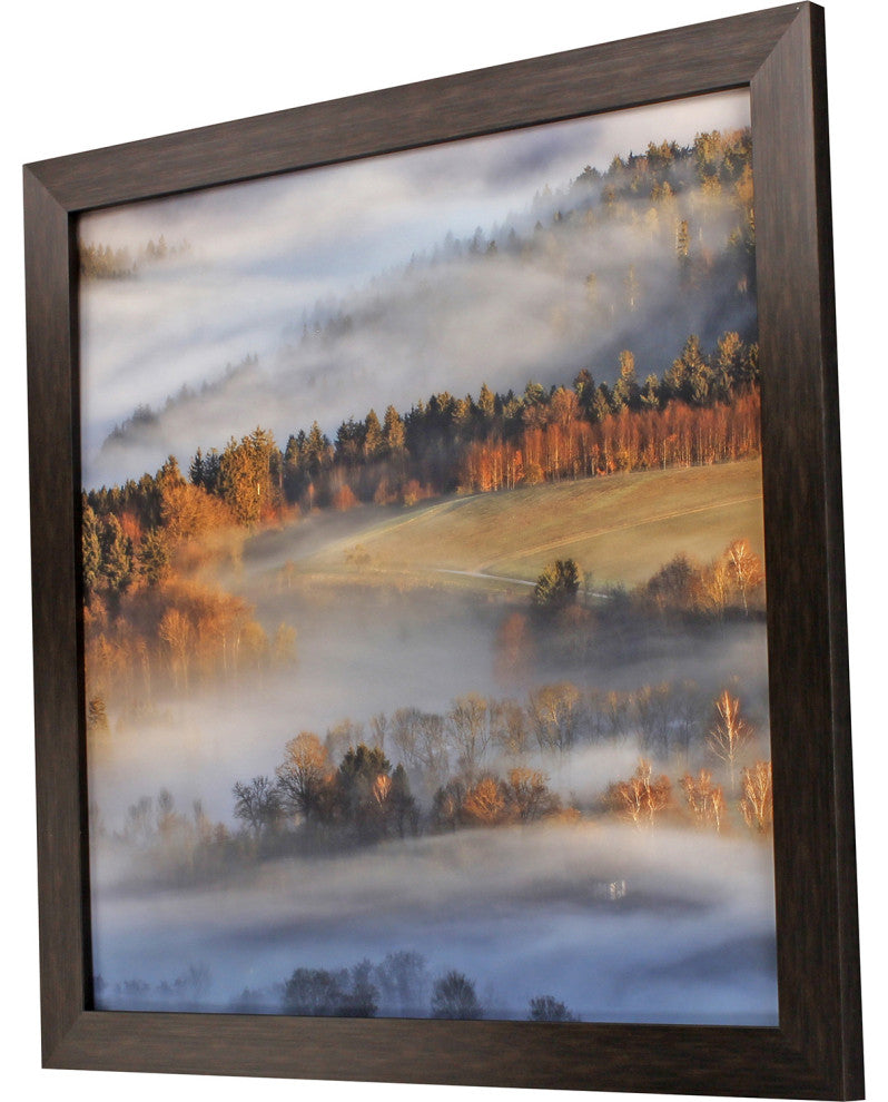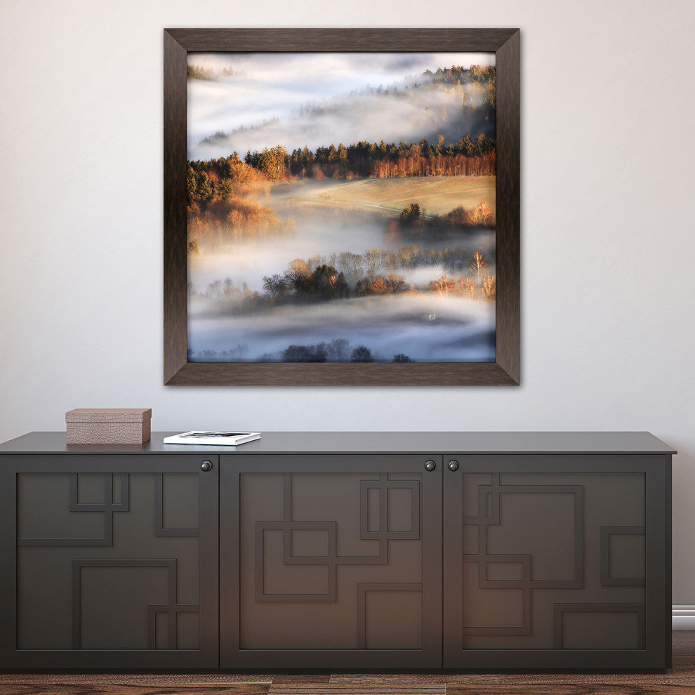 A morning fog encompasses a mountain landscape. Framed in a block profile moulding in a dark wood finish.