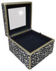 Fantastic and fabulous reverse painted mirror box with two tiers. Mirror on inside lid. Use as a jewelry box or remove the tiers for a luxurious catch all for remotes or whatever you need to hide. In a fun blue with silver dots pattern. 9.1"x9.1"x5.9". Arcadia Home designs are artisan-made. The handmade process creates individual variation, making each Arcadia Home piece truly unique. The mirror in reverse-painted glass products should be cleaned with a soft clean cloth. The borders and edges, which are wood, should be carefully cleaned with a wood polish such as Pledge.