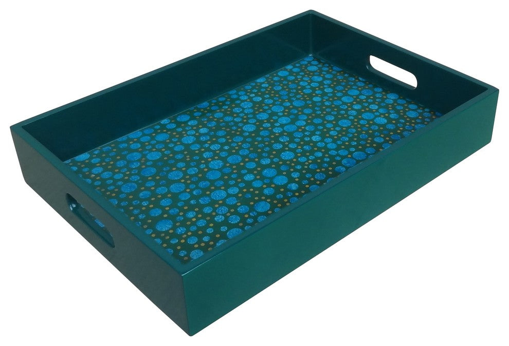 Wonderful tray made in a reverse painted mirror technique. Lively blue "bubbles" design. 15.6x11"x2.6".Arcadia Home heirloom mirror designs are created using the technique of reverse painted glass, which has been practiced in Peru since the 16th century. The quality of craftsmanship on display in these fair trade glass pieces is a testament to the artisan''s mastery of this time-consuming and difficult process, which requires attention to detail, precision, and patience. By purchasing this design, you are joining our efforts to support artisans worldwide. As handmade pieces, each Arcadia Home design is as unique as the artisan who created it. The mirror in reverse-painted glass pieces can be cleaned with typical glass cleaner, and the borders and edges, which are wood, can be cleaned with a wood polish.