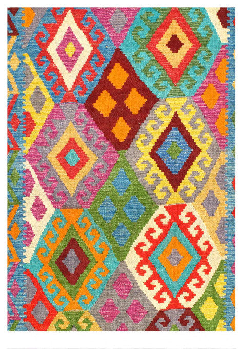 Embodying timeless geometric designs that have been admired for generations, this collection boasts refreshing colors that will be a perfect addition to your home Flat-weaves & Kilims, Geometric style kilim with Blue, Green, Grey, Purple, Red, Yellow accent colors Imported from Pakistan and crafted using the finest weaving techniques Flat-Weave and constructed from 100% Wool with 100% Cotton foundation