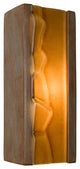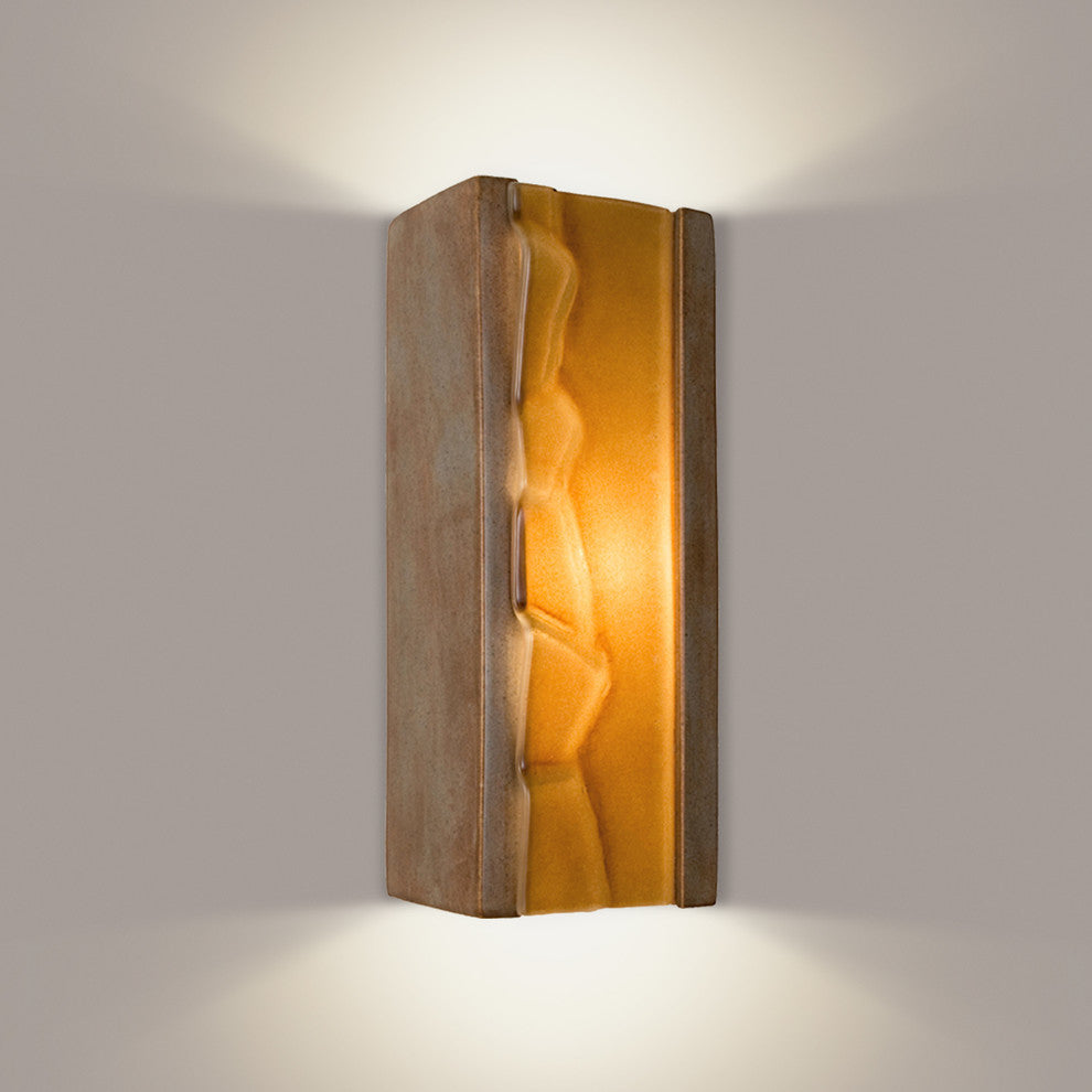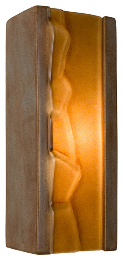 This one-of-a-kind wall light integrates Caramel fused art glass made from reclaimed window glass and Spice kiln-fired glazed ceramic. The slim lines of this compact rectangular sconce are harmoniously complemented by the three dimensional surface along the left edge of the glass pane. Light washes the wall through openings at the top, the bottom and is naturally diffused through the glass adding to the illusion of water flowing over rocks in a mountain stream. Subtle color and texture variations are the hallmark of a truly handcrafted piece of art.