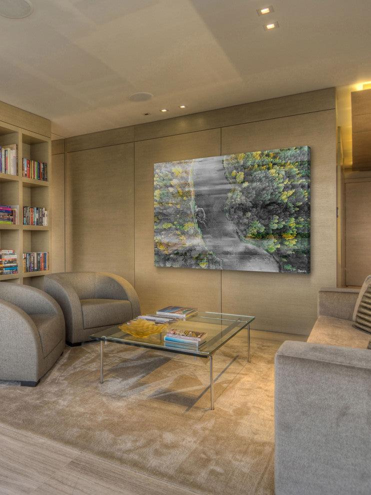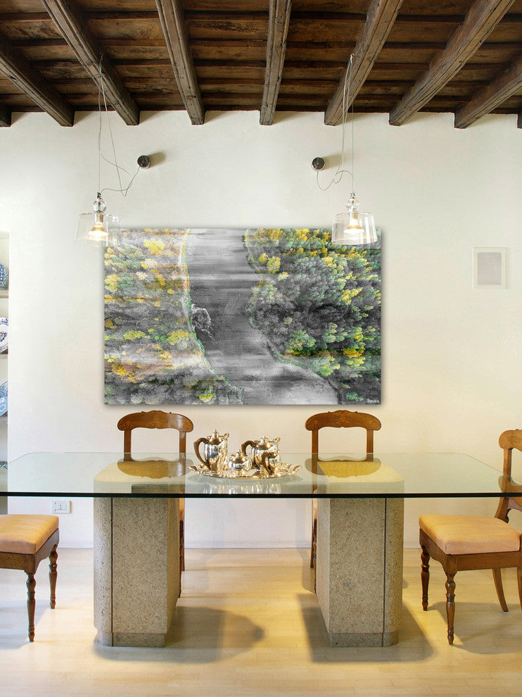 Striking and unique, the "River Run" Painting Print On Wrapped Canvas by Parvez Taj will bring your walls to life. Printed on canvas, this 18 inch wide by 12 inch tall contemporary artwork will make a statement in any living room, dining room, or bedroom.- Fine art canvas print by Parvez Taj- Professionally hand stretched- Gallery wrapped in sustainable, non-warping Wood- Arrives ready to hang- Made in the USA- Includes a certificate of authenticity- Artist signature on the front