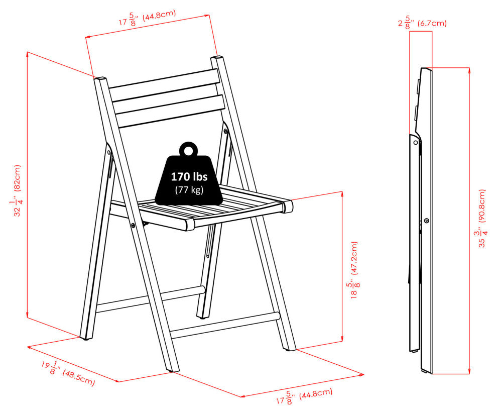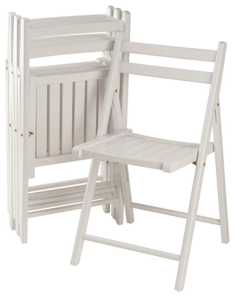 The Winsome Wood Robin Folding Chair set has never looked so handsome. Finished in a classic white, this 4-piece set of solid wood chairs is an indispensable addition to any home. Smooth slatted seats give a classic yet clean look that can complement almost any style. Sitting at 17.4"�H from the ground and the support from the double-bar backs allow for extra comfort and relaxation. Pull up the chairs for a game of cards or bring them out when company comes over and have extra seating around the dining table or living room. These chairs tuck away nicely against one another, when not in use, for compact storage and helping you save precious floor space. This makes them an excellent choice for small spaces. The lightweight, portable design allows for easy transport suitable for parties, tailgating, camping trips and other social gatherings. The Robin collection is available in four finishes and are ready to use. No assembly is required and for your convenience the set is packed and shipped in 1 box.