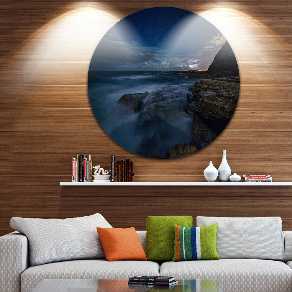 Bring Contemporary Abstraction to your home with this large Circle Metal wall art. This Rocky Blue Ocean at Nighttime Metal Artwork makes it the focal point of any room or office.