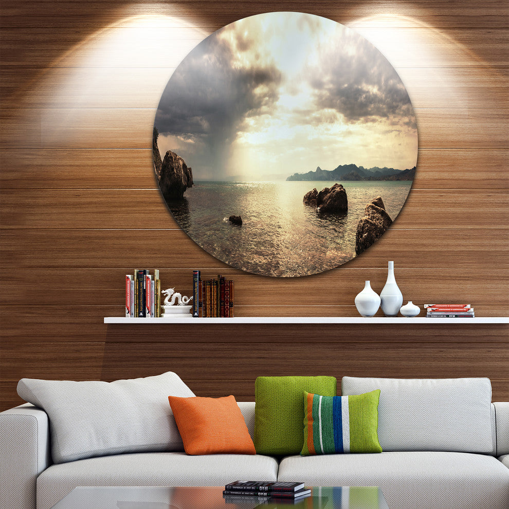 Bring Contemporary Abstraction to your home with this large Circle Metal wall art. This Rocky Seashore under Clouds Panorama Metal Artwork makes it the focal point of any room or office.