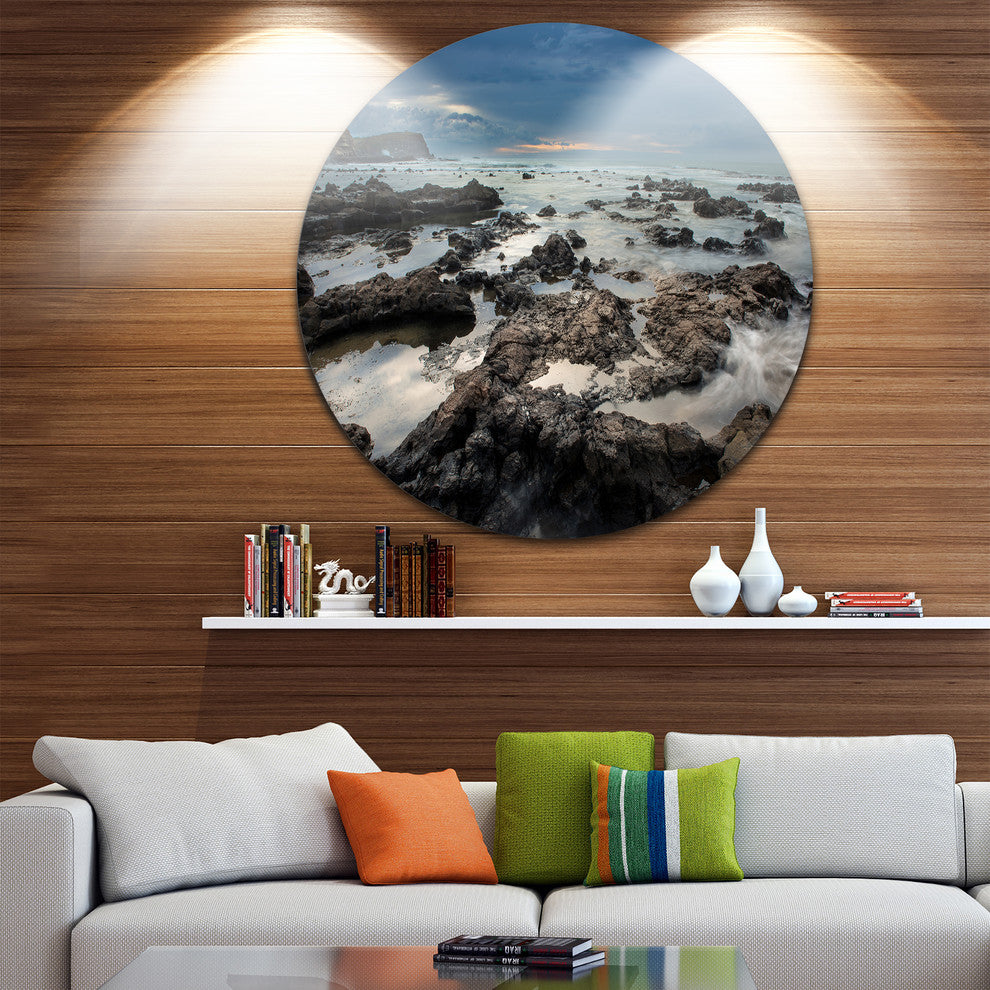 Bring Contemporary Abstraction to your home with this large Circle Metal wall art. This Rocky Seashore with Blue Sky Over Metal Artwork makes it the focal point of any room or office.