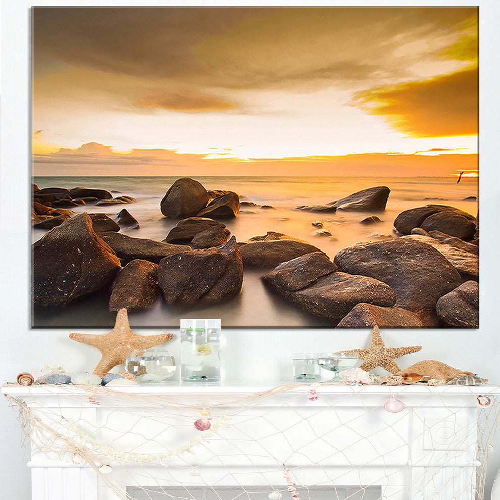 The Rocky Yellow Tropical Beach canvas art print is sure to make an impression on anyone who sees it. This artwork is gallery wrapped around a 1-inch solid wood frame and arrives carefully packaged and entirely ready to hang on the wall. Design Art only uses the highest resolution and pigments to ensure a crisp colorful print that is never faded or pixelated. This artwork is sure to be a conversation starter in any home or office.