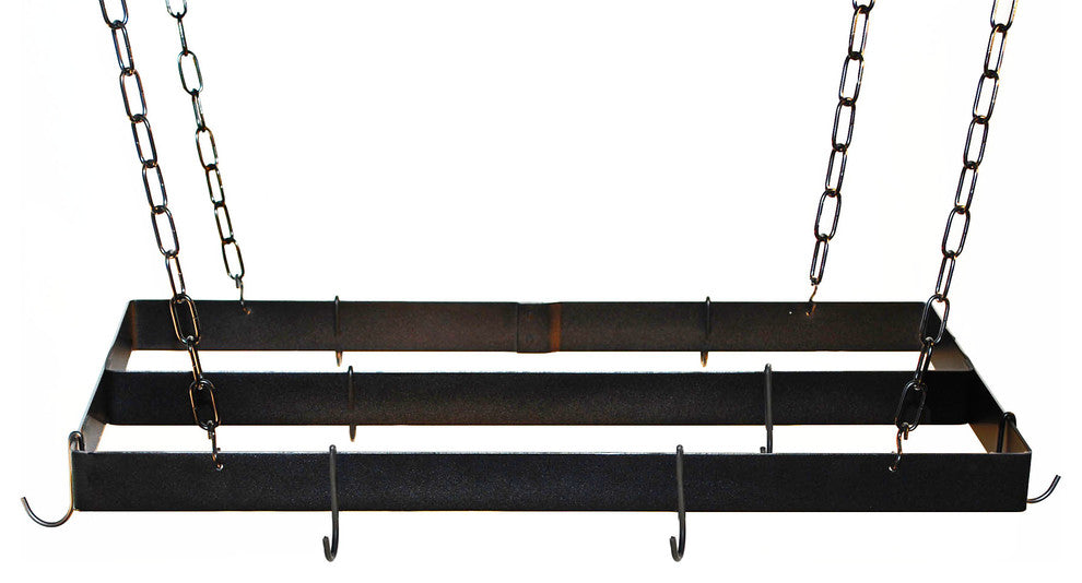 Black USA Made Rectangular Potrack Measures 30" x 15" with a Centerbar Measuring 30". Pot rack includes 8 Black regular pot rack hooks, 4 black "S" hooks, 4 Ceiling Hooks, and 4 Pieces Chains for Mounting.