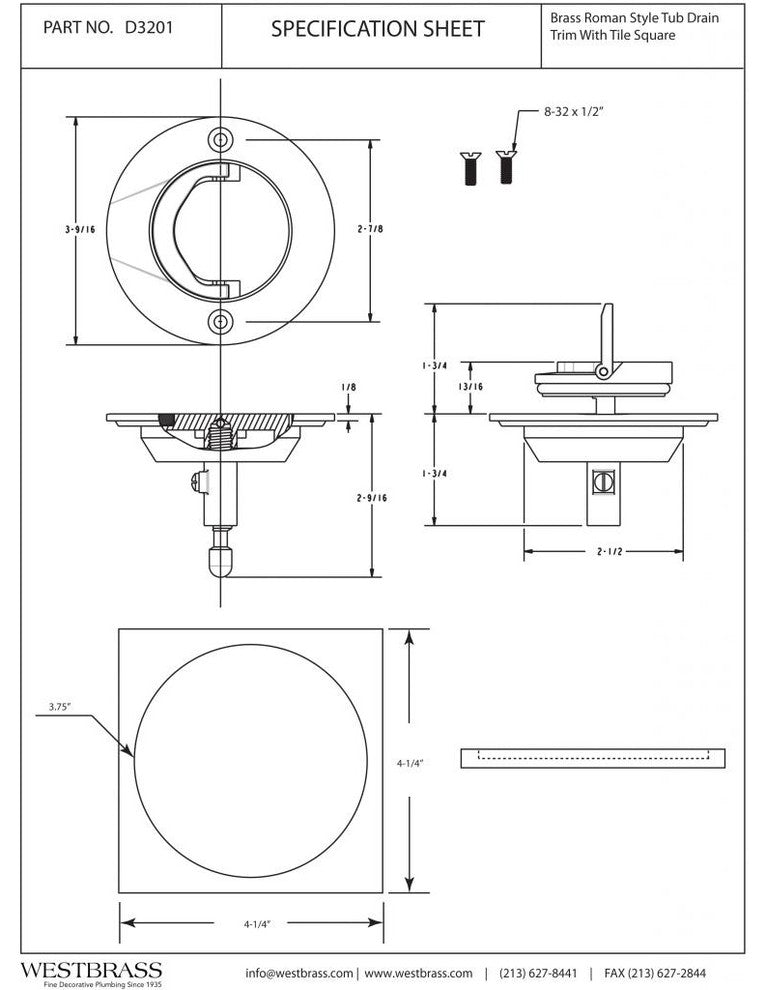 Westbrass Roman Tub Drain Trim, fits 3-9/16 in. OD and 2-7/8 in. hole-to-hole replacement top only, with a 4-1/4 in. tile square, for a roman tub drain. Made of solid brass this product is manufactured to fit already installed roman tub drains from Oatey (#151),Casper (140) Plumbing Products EZ-Test 2 and equivalent models from other manufacturers.