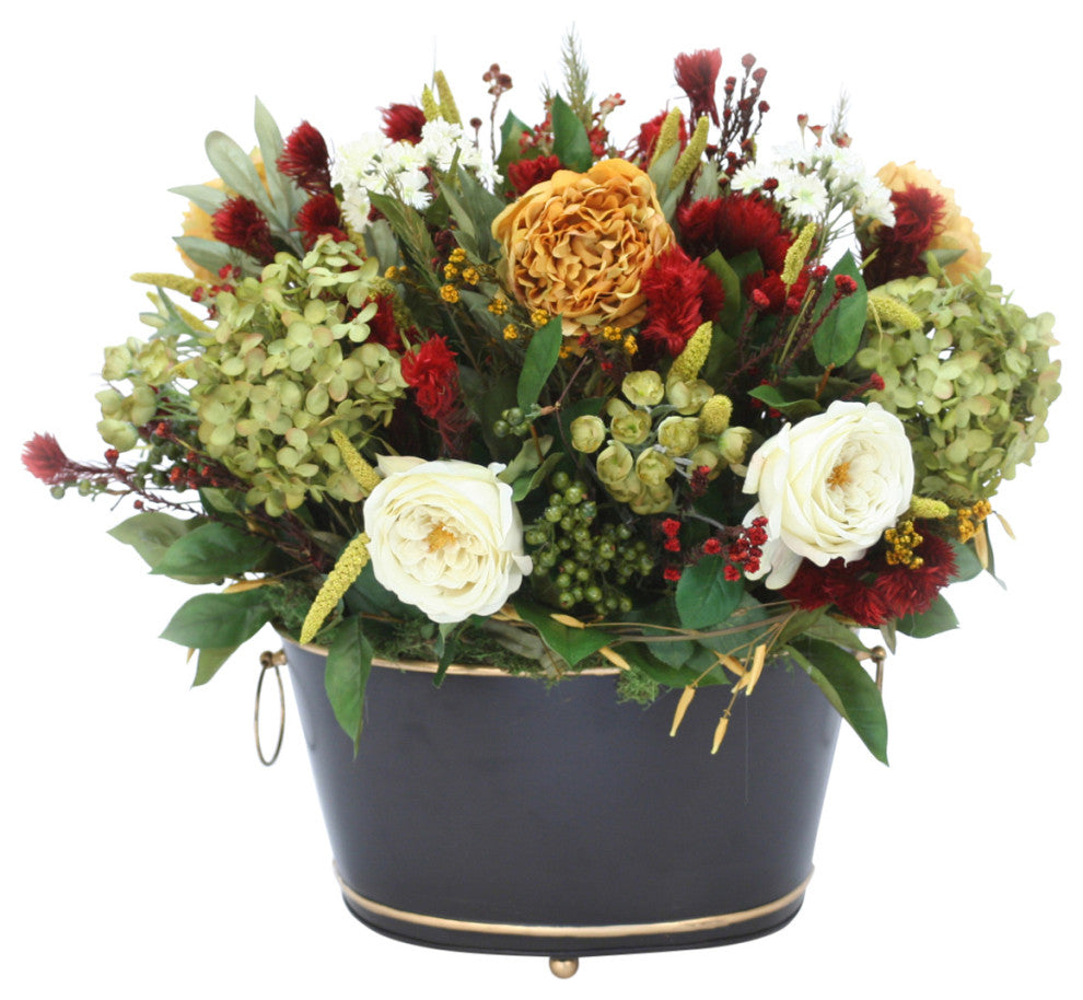 Elegant artificial Rose and Hydrangea with Mixed Flowers in Tole Planter.• Made in the USA of imported and/or domestic components. Each floral is handcrafted by a single designer, not mass produced. Production lead-time from receipt of order to shipment is normally 10-12 business days.• Although "silk" is a common term used to describe artificial flowers and foliage, the floral designs are actually made of materials that have more durability and do not fray or fade as silk does. Each bloom, leaf, and stem is individually wired to maintain realistic form, while the subtle colorations, shadings, and striations in the natural flower are duplicated to perfection!• All product dimensions are approximate because each arrangement is individually hand-crafted of artificial floral components that are themselves wired and "arrange-able". So each is truly one-of-a-kind, a professionally arranged floral, not form mold assembly line design.• Treat Distinctive Designs florals, plants, and greenery the same as you would live plants by avoiding exposure to direct sunlight or extremes of heat or cold. Exposure to intense UV rays could cause eventual discoloration.• Cleans easily with a duster or dryer on cool setting.• No assembly or "fluffing" required. Arrives ready for display.