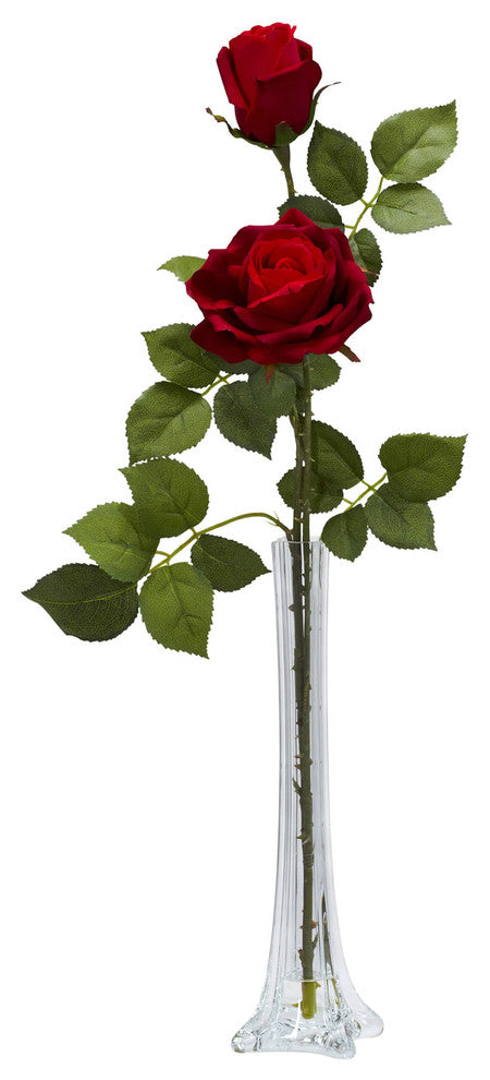 The very definition of elegance, the Rose stands head and shoulders above all other flowers. And standing tall and elegant is what this Rose does best. A single stem splits into two blooms one full, one budding to give a classy radiance that is unequaled. With lush leaves and a tall vase w/ faux water, this makes the perfect gift for that someone special.