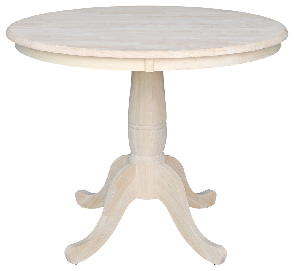 International Concepts home furniture is a beautiful collection of high quality, wood furniture with a traditional and elegant look. Featuring pieces you will be proud of for years to come and will easily complement any decor. All pieces are manufactured from solid Parawood which is more commonly referred to as Rubberwood. Parawood is eco-friendly in terms of being a fantastic renewable resource. As Parawood is considered to be a hardwood, it is actually a truly durable and strong wood.Table dimensions: 36"W x 36"D x 28.9"HMade from solid wood36" Round table topReady to assembleFor use with dining chairsPedestal base has 4 feet for maximum supportButcher block top