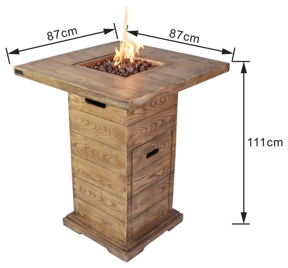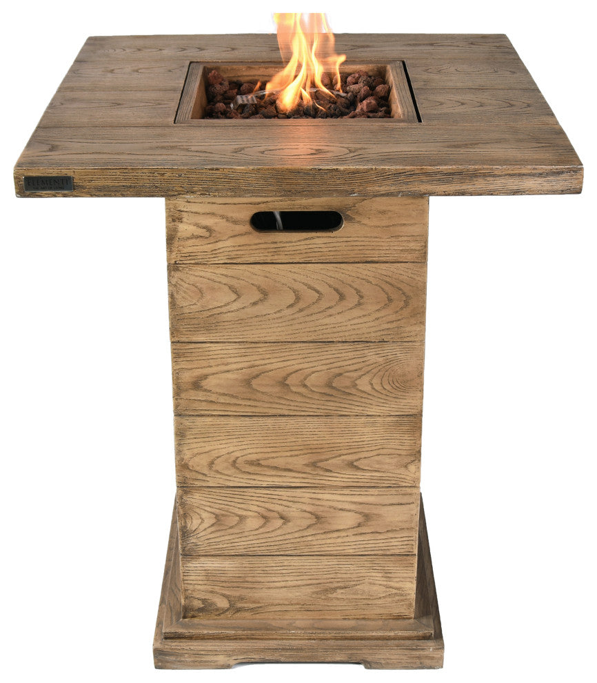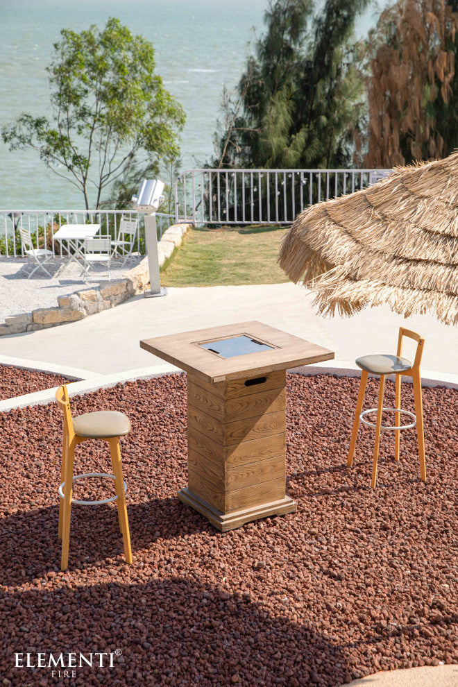 The Rova Bar Table is the perfect addition to your outdoor space, offering both style and versatility. This elevated, wooden-style fire pit table is crafted from reinforced concrete, providing a serene setting for everything from lively dinner conversations to sipping your favorite cocktails by the fire. Its robust, weather-resistant design ensures the Rova withstands the elements, while its easy-to-clean surface makes maintenance a breeze. Whether you''re unwinding with friends, enjoying summer sunsets, or playing cards around the fire, the Rova creates a warm, inviting atmosphere year-round. - Wooden-Style Concrete Design - Want the appearance of wood, with the durability of concrete? Look no further than the Elementi Rova, as the innovative piece is comprised of glass-fiber reinforced concrete to mimic authentic wood, while offering all the benefits of durable concrete. - 40,000 BTUs Output - Cozy up next to friends and family by the fireside, with a 9.8" stainless-steel burner rated for 40,000 BTUs of output. The adjustable flame may be modified to create the perfect level of comfort and warmth. - Hassle-Free Electronic Ignition - Enjoy the gentle flicker of flames over lava rocks in seconds thanks to a hassle-free electronic ignition. Simply light the flame with the CSA certified electronic ignition to enjoy a balmy evening.