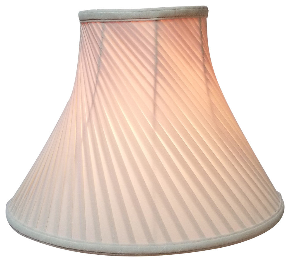 This lamp shade is a showstopper! The Twisted Pleat Lamp Shade serves up classic pleated style with a "œtwist."? Made of tailored silk-type shantung fabric with an off-white softback lining (black shades have gold softback lining) to create a warm, soft glow. The Twisted Pleat Lamp Shade is part of the Royal Designs, Inc. Timeless™ Basic Shade Collection. Royal Designs has been in the lamp shade business since 1993 with our multiple shade lines that exemplify handcrafted quality and value. Height is measured by slant height from top to bottom of the lampshades"™ front face. Measurements listed as (TOP x BOTTOM x HEIGHT). Please measure your existing shade--a replacement harp may be needed for a proper fit or additional adjustment if changing height of shade.Exterior Fabric: Hand Tailored Silk-Type Shantung (except Linen, Mouton, Burlap & Faux Rawhide fabrics)Interior Fabric: Off-White Softback Lining (Black, Burlap & Faux Rawhide fabrics have gold lining)Washer: Standard brass-finish spider fitter, use a finial to fasten shade. (All shades with 9"+ top diameter have a V-Notch fitter for use on a 6 or 8 reflector bowl)Trim: Top and bottom trim (single or double) with vertical pipingFrame: Heavy grade rust resistant metal frameBulb: Suggested maximum wattage is 150-watt for most sizes Height is measured by slant height from top to bottom of the lampshades front facePlease measure your existing shade--a replacement harp may be needed for a proper fit or additional adjustment if changing height of shade