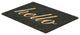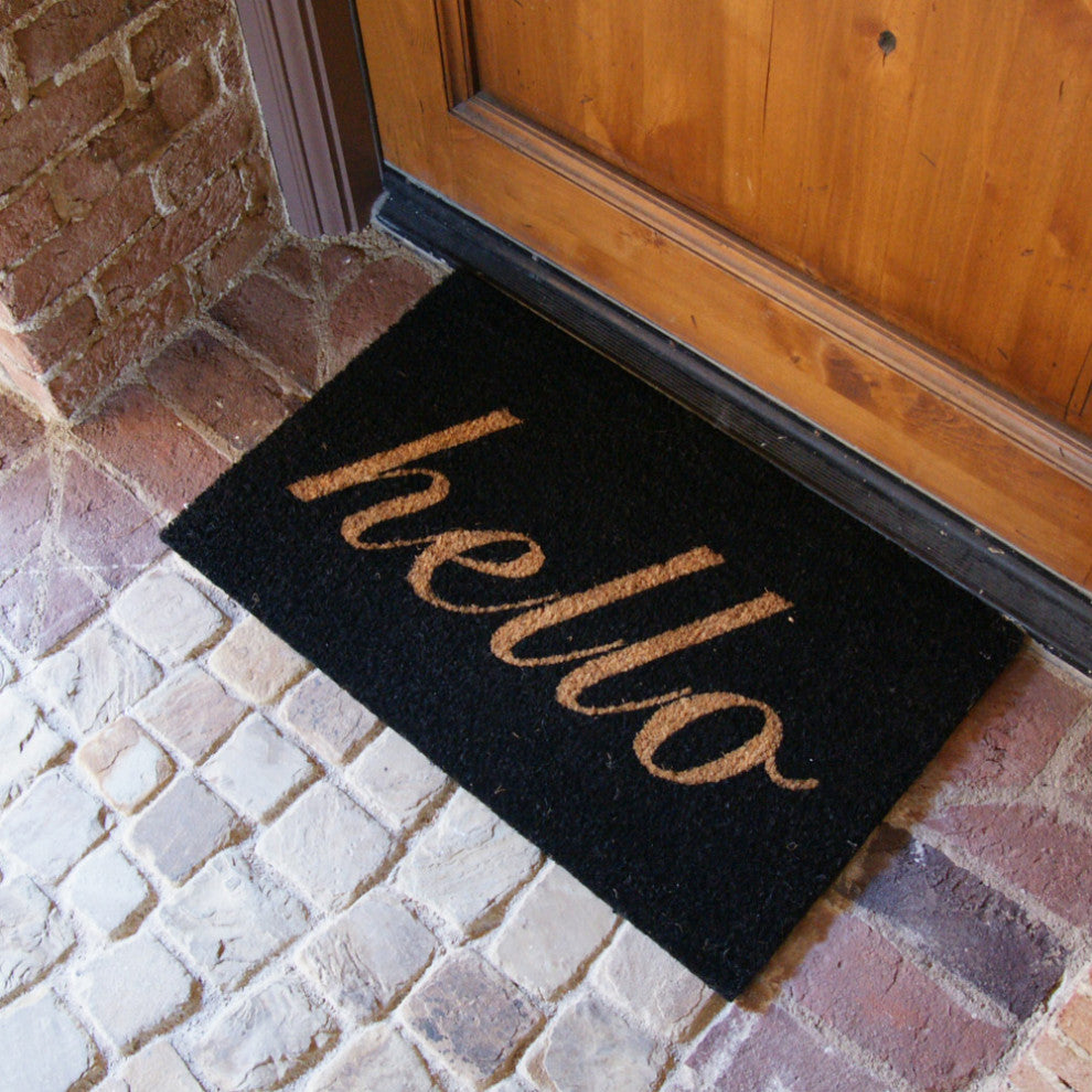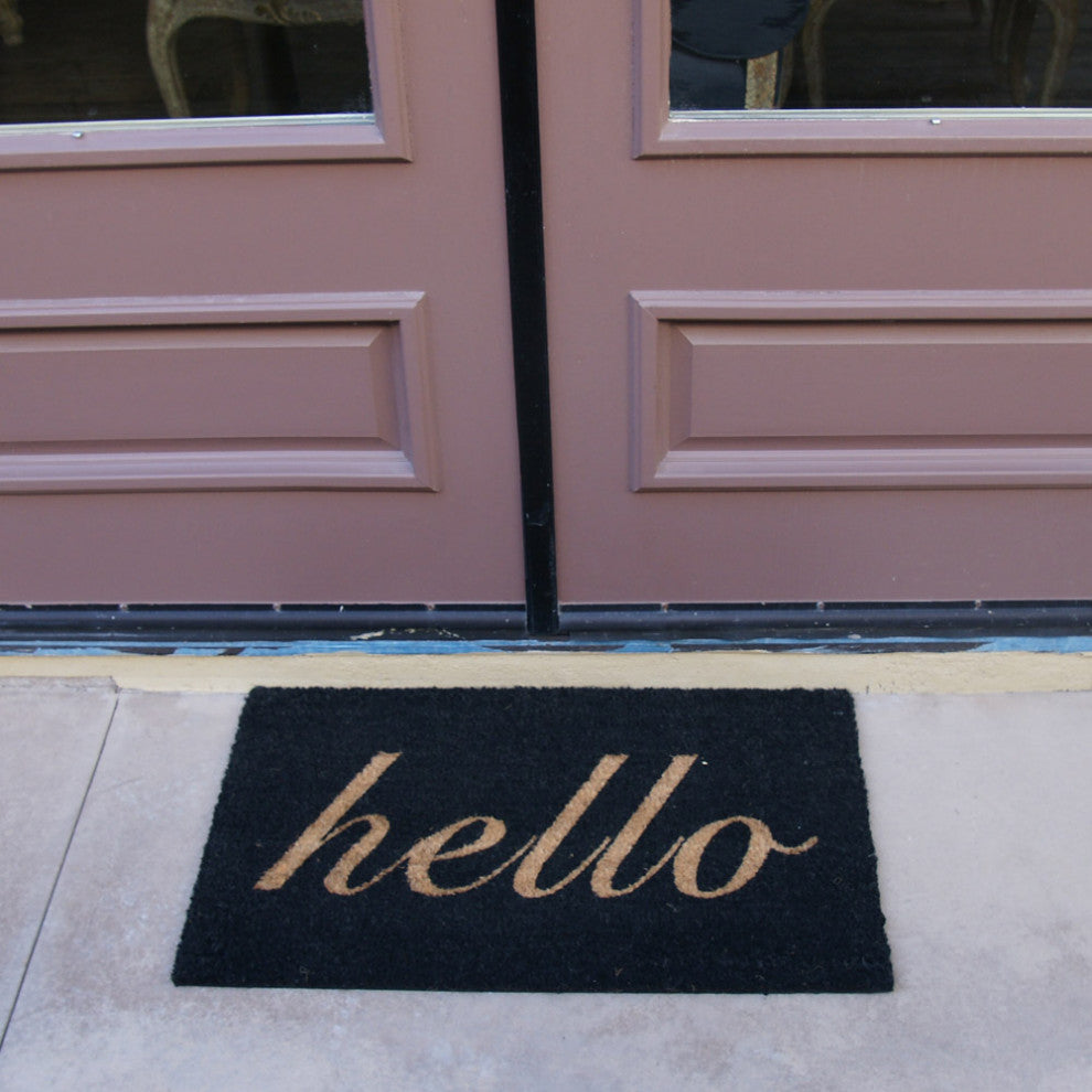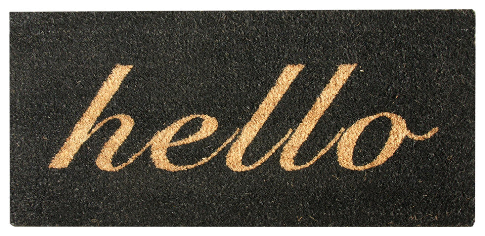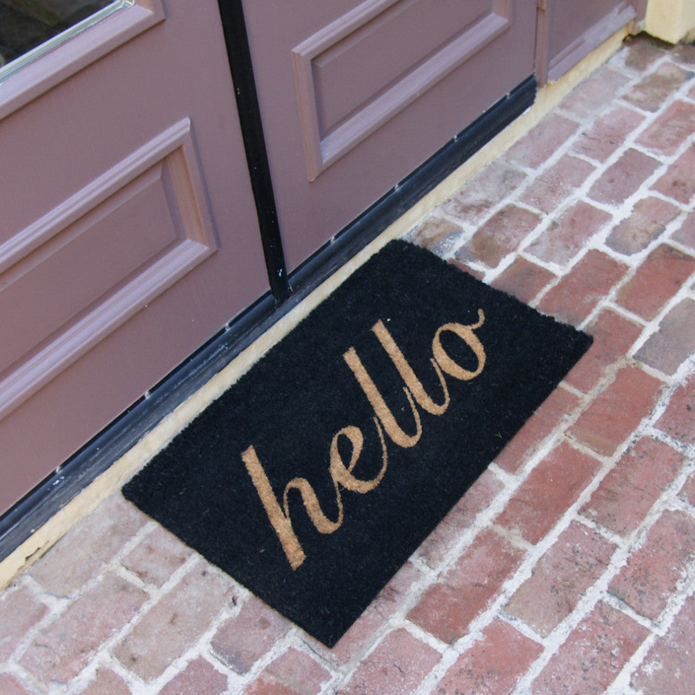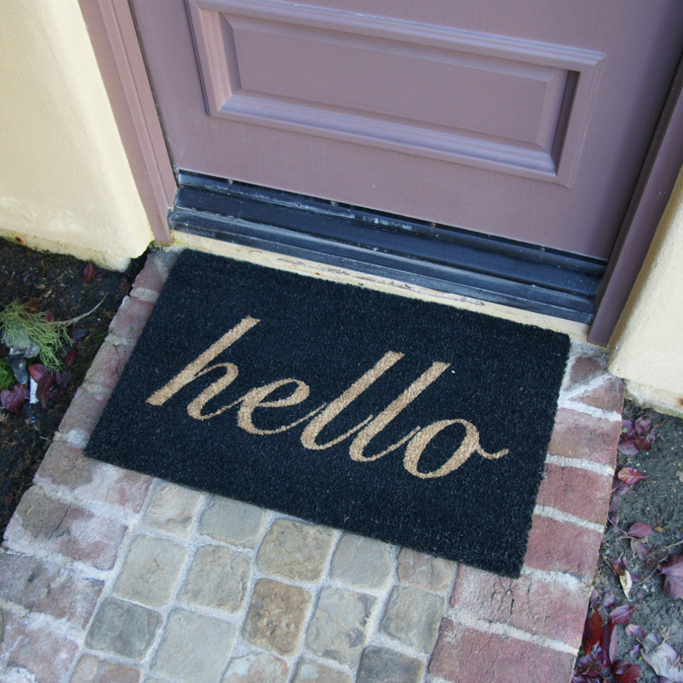 Rubber-Cal�s �Minimalist Expression� is a contemporary hello doormat with a sleek and simple design. Featuring a black background, the lettering is �cut out� of the design to show the natural coco matting beneath the paint. The home doormat reads �hello��a sweet and simple greeting to your guests. This welcome coir mat creates a clean, minimalist aesthetic that is sure the complement the look of any home. And there is no need to worry about that design bleeding, fading, or being rubbed away with use. The designs on our �hello� welcome mats are painted using a heavy-duty emulsion paint, similar to the kind used to paint the walls of buildings. The paint resists abrasions and moisture, resulting in a long-lasting design and a decorative welcome mat that still looks vibrant after months of use. This mat is made from natural coir fiber, which is derived from coconut shells, to achieve outdoor weather resistance and shoe-scraping capabilities. Coir fiber is fast-drying and resists abrasions, moisture, ozone, and UV rays, allowing coco doormats to be used year-round, throughout any weather conditions. The rigid coir bristles are perfect for reaching into the small nooks and crannies of shoe soles, pulling out dirt, debris, and excess moisture. Unwanted filth gets trapped on the doormat�just below the surface�to prevent it from being tracked indoors or onto another pair of shoes. Once the coconut doormat starts to look dingy, do not fret! Cleaning is as easy as taking your home entry mat outside and giving it a vigorous shake. If any stubborn dirt sticks around, you can use a vacuum to achieve an even deeper cleaning. This durable outdoor welcome mat also includes a thick PVC backing to enhance traction beneath the mat and prevent it from sliding out of place. Rubber-Cal�s coir welcome mats combine fashion and function to offer a long-lasting product with a stylish design.