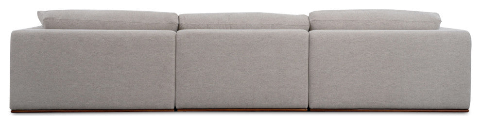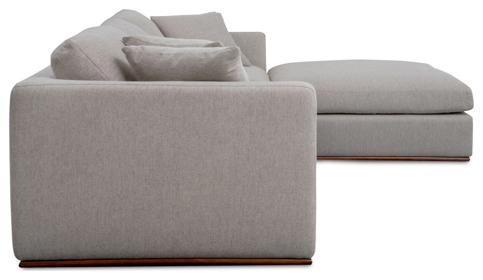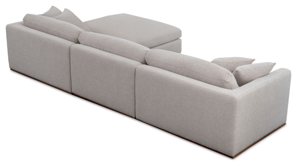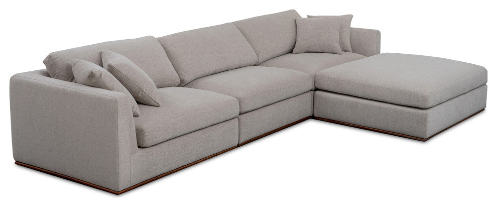 The Rue modular sectional features a generous 70% feather-fill topper within its seating, accompanied by toss cushions for an added layer of coziness. Its elegant silhouette is highlighted by a rubber wood base, creating a sleek floating appearance, all supported by subtle wooden legs. Designed with extreme comfort in mind, this modular embodies easy, neutral styling.