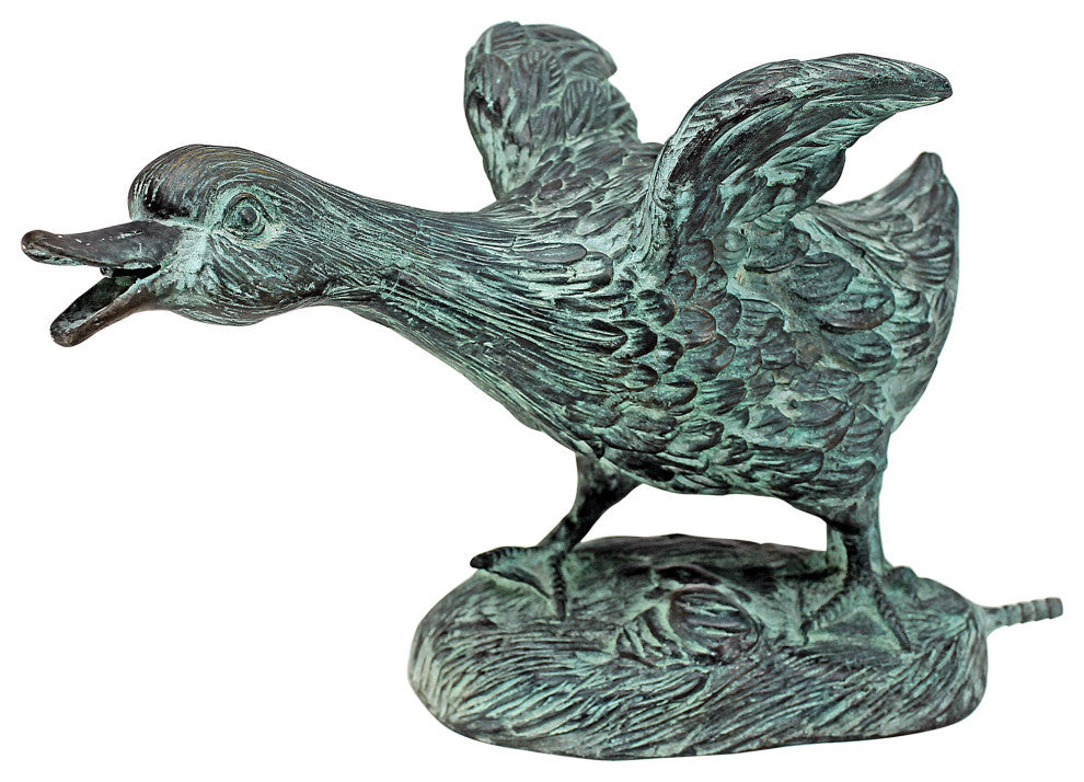 Our piped spitting duck statue is in a hurry to cool off in a pond, but don''t let its charming waddle distract from the pleasing aesthetic of solid bronze statuary. Because the beauty is in the details, our Design Toscano-exclusive high-quality bronze garden statue is finished with an antique verdigris patina, sure to bring your pond or garden to life. Our weighty bronze duck statue is cast in the traditional lost-wax method, which highlights every detail from feather to beak and guarantees lasting beauty. Piped to optionally cascade flowing water from the duck''s beak into your pond or fountain. Accommodates Pump Kit HS-7590. Color patina is applied by hand one piece at a time, tone may vary slightly. Running Duck: 7"Wx13"Dx7.5"H. 7 lbs.