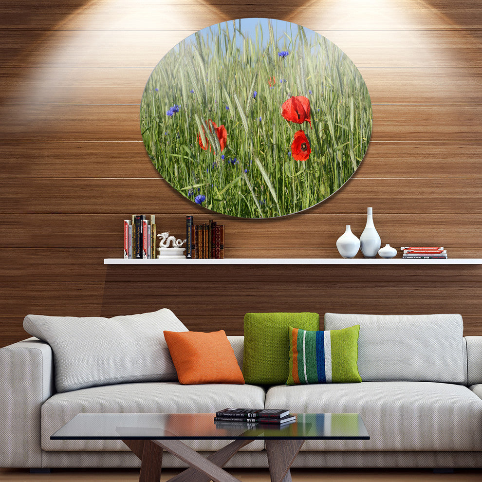 Bring Contemporary Abstraction to your home with this large Circle Metal wall art. This Rural Landscape with Red Poppies Metal Artwork makes it the focal point of any room or office.
