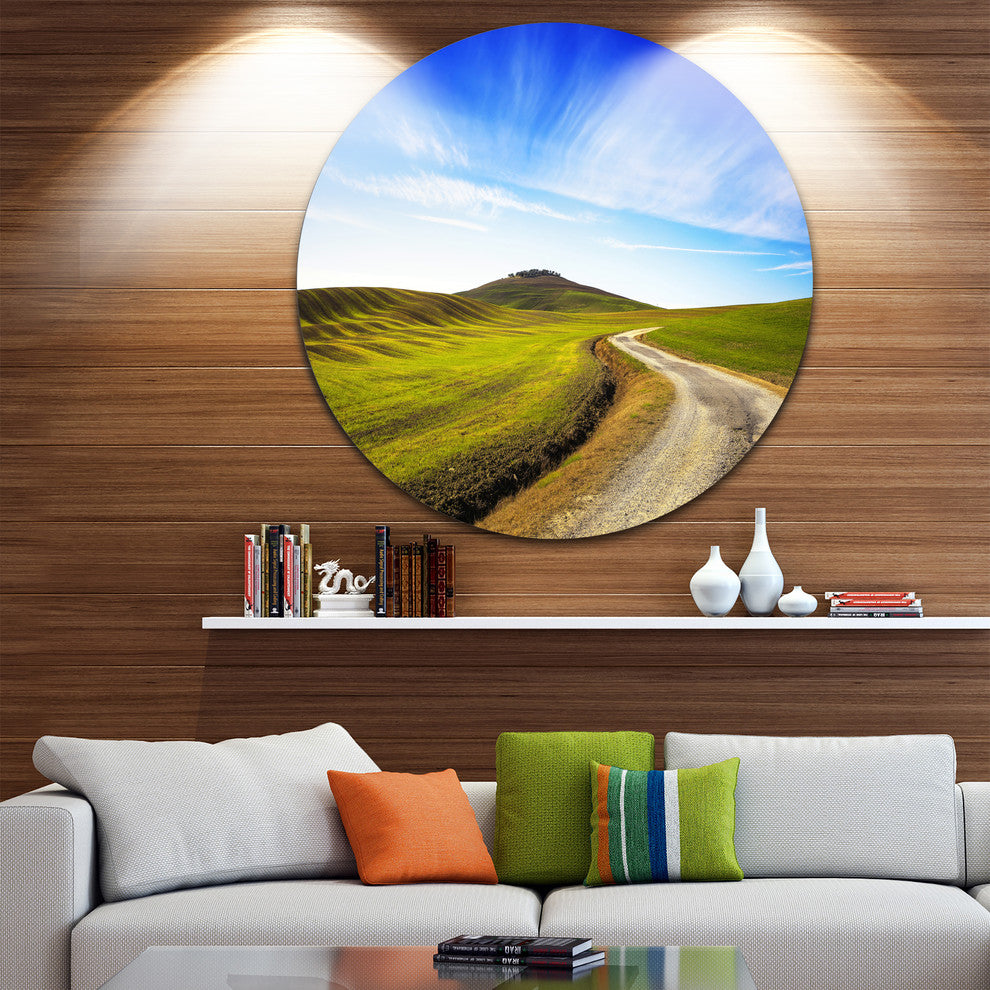 Bring Contemporary Abstraction to your home with this large Circle Metal wall art. This Rural Road and Olive Trees Uphill Metal Artwork makes it the focal point of any room or office.