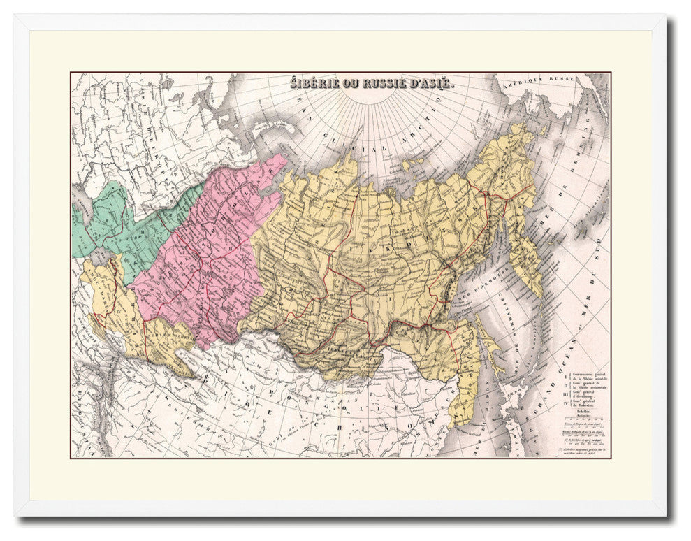 Russia Siberia Vintage Old Map Print On Canvas With Picture Frame 28" X 37"
