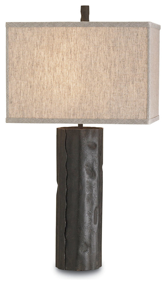 Speaking to both rustic and industrial aesthetics the unique construction of the Caravan Table Lamp features wrought iron in a rough hewn form. A simple rectangular Natural Linen shade contrasts the cylindrical form of the base.