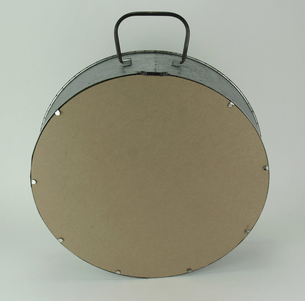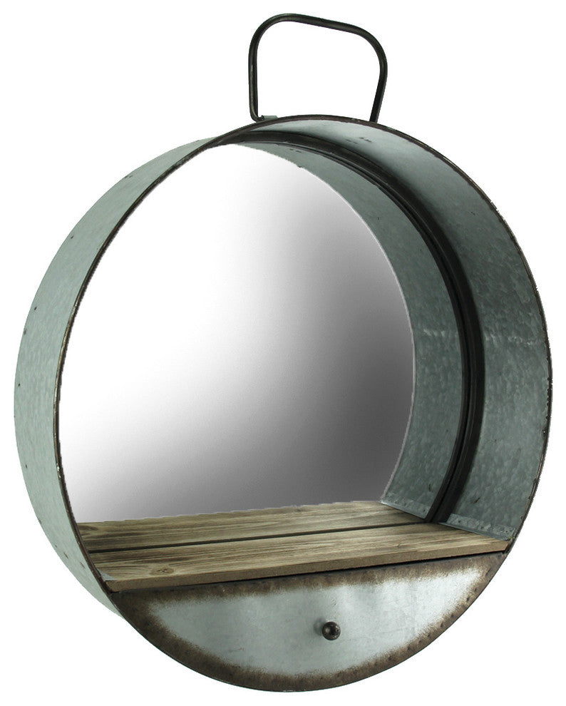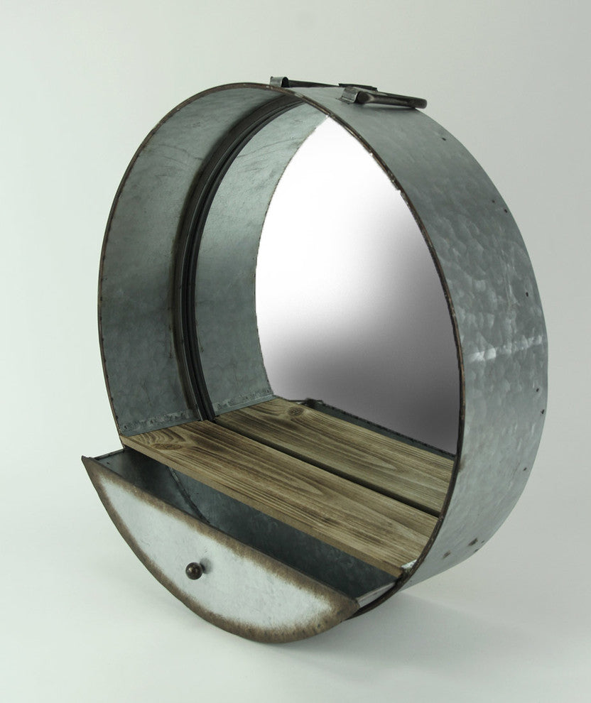 Rustic Galvanized Metal Tub Frame Round Wall Mirror with Drawer