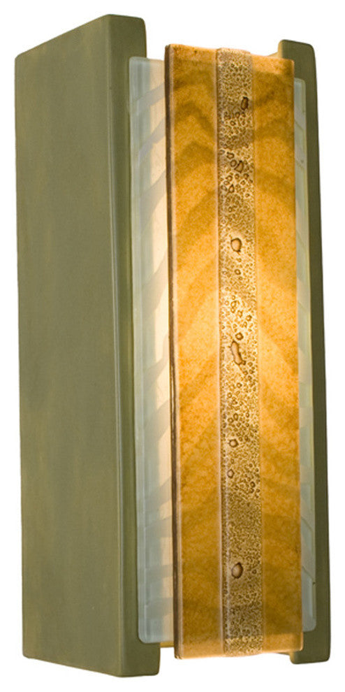 This one-of-a-kind wall light is fun, bold and adventurous. It integrates fused art glass made from reclaimed window glass and kiln-fired glazed ceramic. The Safari Wall Sconce features two different layers of fused glass panels- zebra print and a stripe of intriguing bubbles atop a compact rectangular ceramic base with a Sagebrush finish. Light shines through openings at the top, the bottom and illuminates the dramatic Albino Caramel patterns. Subtle color and texture variations are the hallmark of a truly handcrafted piece of art.