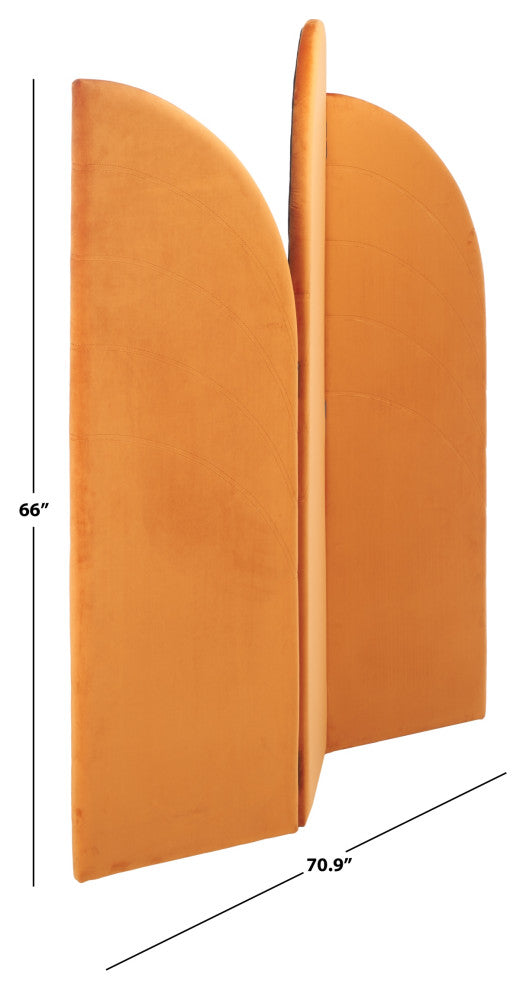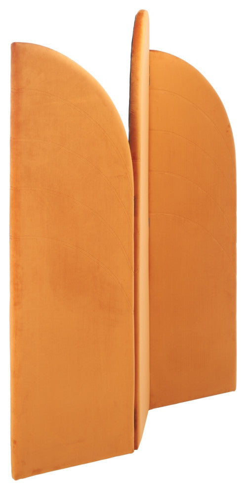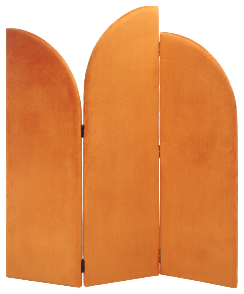 Utilize your space to the fullest with our plush and stylish Celestino tri-fold screen. The arched profile of the screen is elevated with rich texture and color. Each screen showcases a half arch to deliver an eye-catching rhythm and style. Fully upholstered in velvet, the screen lends a supple and polished touch to any corner. It is enriched in a bright orange hue to add a pop of color and elegance to any large or small space. From serving as a partition or privacy screen to a plush accent, our tri-fold screen offers style with a practical touch.
