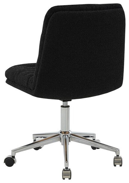 Embrace the modern comfort of our Decolin desk chair. The streamlined profile of the chair is enriched with neat and elegant channeling detail. The back and seat both remain generously padded to provide a firm and comfortable seat. Upholstered in black boucle, our sleek desk chairs harmonize with any office setting. Both functional and stylish, the chair swivels 360 degrees and is installed with casters to provide ease of movement between the file cabinet and desk.