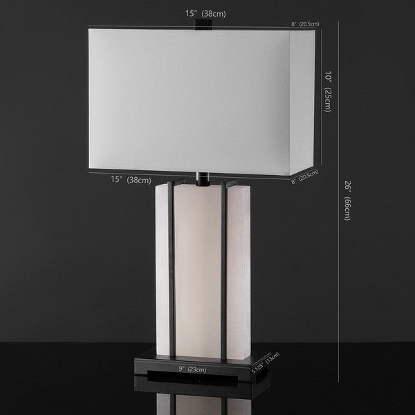 Elevate your decor with the sleek and graceful stature of our Fantasia table lamp. The clean lines and refined industrial aesthetics of the lamp bring effortless sophistication to any corner. It features a rectangular base in white alabaster, lending grace and softness to the crisp profile. Accented with black metallic hardware, our table lamp remains an easy favorite for any modern and contemporary space. It is completed with a white rectangular shade to beautifully anchor your bed, sofa, or console table in pairs.