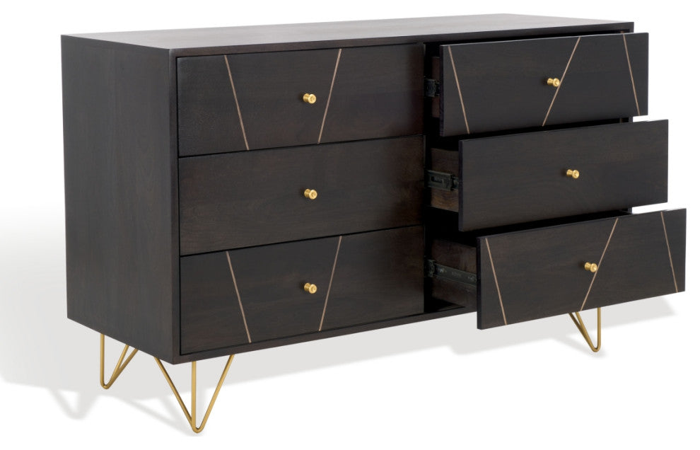 A rustic-chic piece for the glamorous at heart, the Marigold 6 Drawer Dresser is a high-fashion twist on country-cottage style. Linear brass inlay details shimmer against black-toned mango wood for a captivating couture look, and retro-inspired steel hairpin legs invite a light, open feel to the living room or boudoir.