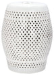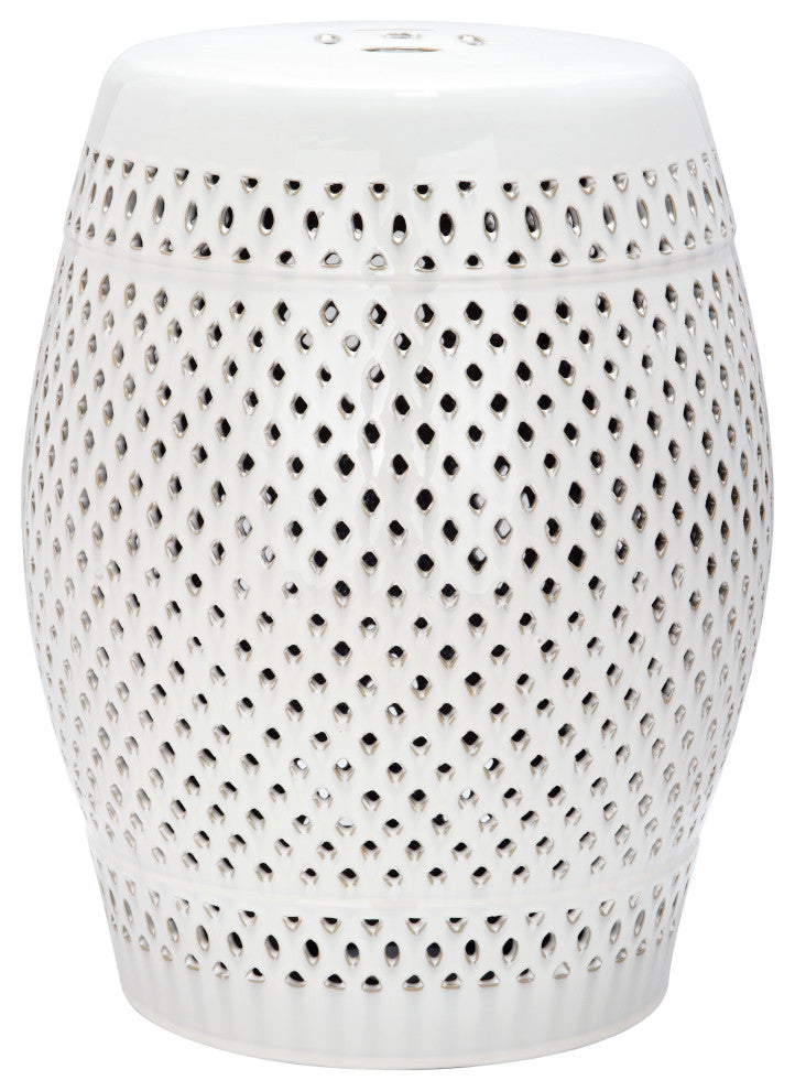 A fresh new interpretation of the classic Chinese garden stool, this striking ceramic design is styled with an elegant overall pierced diamond motif. Crowned with an Asian double linked coin symbol believed to bring good luck, this versatile piece will grace indoor and outdoor settings.•Materials: Ceramic•Finish Surface Treatment: Glazed•Dimensions: 14" W X 14" D X 17.5" H•Weight: 18 lbs•Weight Capacity: 195 lbs•Base Hollow Opening: 5.5"