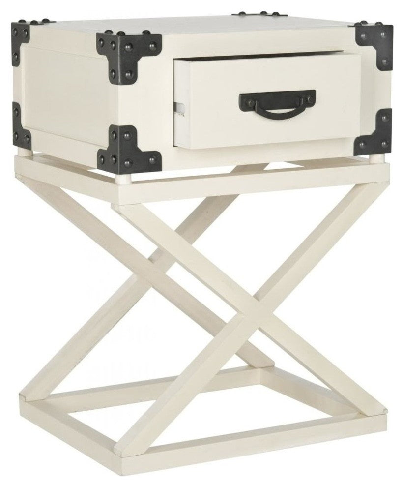 A clever melange of British campaign furniture classics, the handsome Dunston side table is a conversation piece that provides storage and style. Outfitted like a steamer trunk with corner reinforcements, this painted table is crafted of pine.Care Instructions: Dust regularly with a soft, dry cloth. Never use oiled or treated cloths on lacquered finishes. Some finishes can be wiped with a damp (not wet) cloth, followed at once by rubbing with a dry cloth to remove fingerprints and smudges. For persistent spots, gently clean with a soft cloth and a solution of water and mild soap, make sure to wipe dry. Use adhesive felt pads, coasters and placemats to protect your furniture.Materials: Pine, MDF, Wood Veneer, Aluminum AlloyFinish Surface Treatment: Water Based PaintDimensions: 18.9" W x 15" D x 25.6" HWeight: 20.9 lbsWeight Capacity: 25 lbsLeg Height: 17.5"Drawer Dimensions: 11.8" W X 13.3" D X 5" H