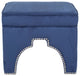 Rest your feet on the globally-inspired Grant ottoman with Moorish arch cutout outlined in handsome silver nail heads. Beautifully upholstered in chic and practical navy brushed polyester with a velvet hand, this fashionable ottoman is crafted of sturdy wood. Equally good looking alone or in pairs, Grant combines comfort and style in the living room, family room or bedroom.