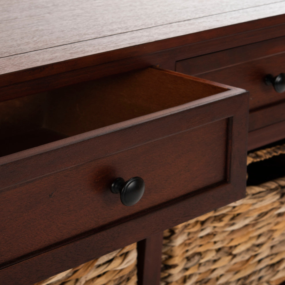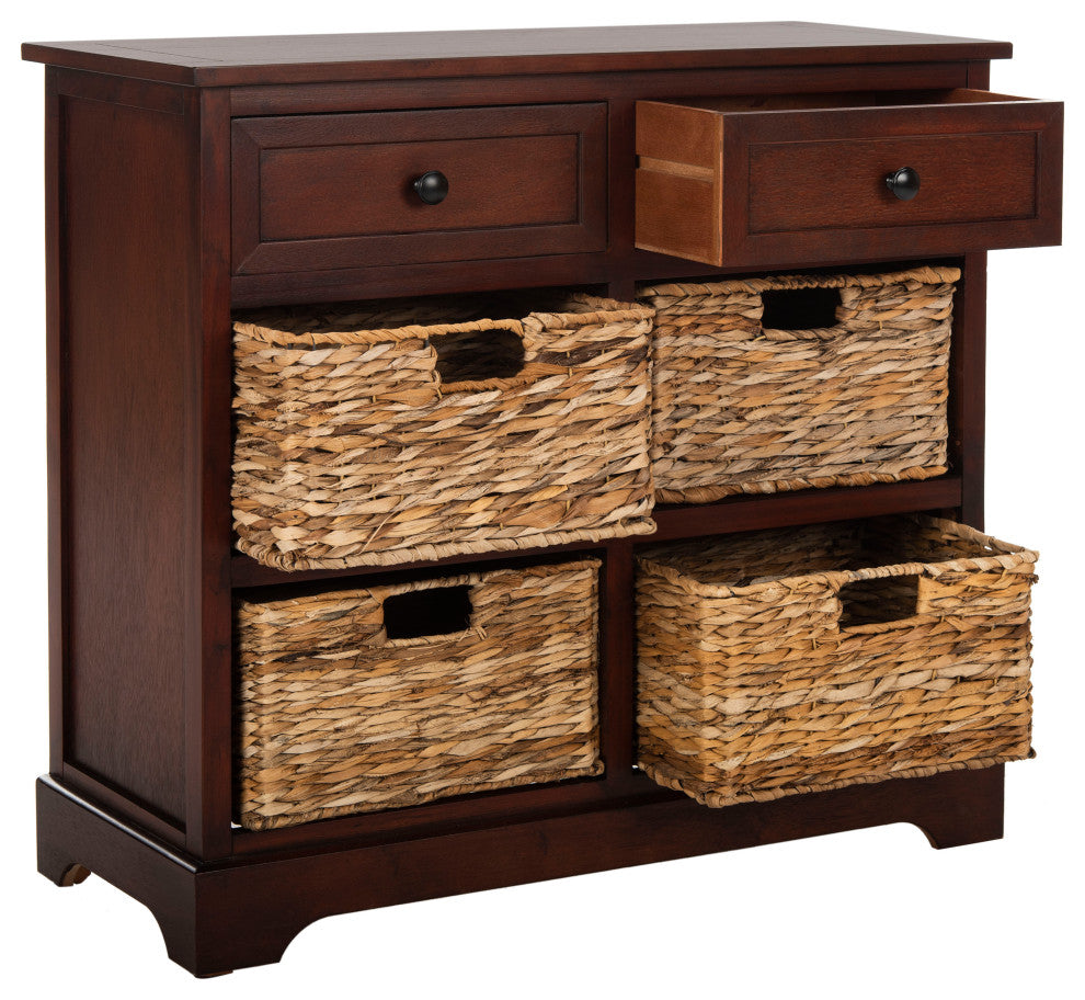 Country charm with an easygoing twist characterizes the Herman storage unit. With its four removable woven rattan baskets with cutout handles and two top drawers for additional storage, finding what you need has never been easier. Herman is crafted of pine with dark cherry finish.Care Instructions: Wood is a natural material with variations of color shade, configuration, streaks, and grain structure. Each individual piece of Safavieh furniture has characteristic markings that will differ from photo and showroom samples. Regular attention and maintenance of fine furniture can ensure its beauty for years to come. Always use felt pads under all articles to prevent discoloration or softening of the lacquer. Plastic and rubber bases on items can discolor wood.Item Dimensions: 29.9" W x 13" D x 27.6"H